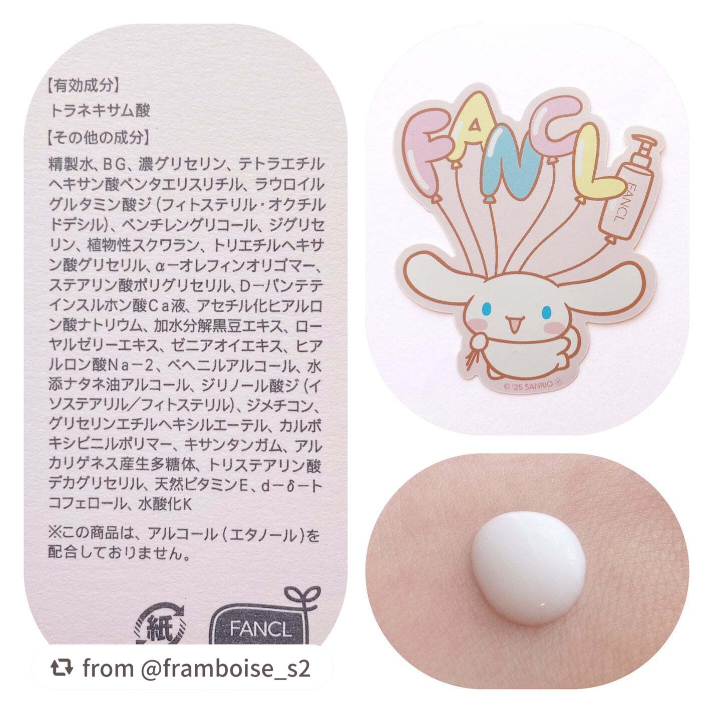 - <150g> トラネキサム酸、精製水、BG、濃グリセリン、テトラエチルヘキサン酸ペンタエリスリチル、ラウロイルグルタミン酸ジ(フィトステリル・オクチルドデシル)、ペンチレングリコール、ジグリセリン、植物性スクワラン、トリエチルヘキサン酸グリセリル、α-オレフィンオリゴマー、ステアリン酸ポリグリセリル、D-パンテテインスルホン酸Ca液、アセチル化ヒアルロン酸ナトリウム、加水分解黒豆エキス、ローヤルゼリーエキス、ゼニアオイエキス、ヒアルロン酸Na-2、ベヘニルアルコール、水添ナタネ油アルコール、ジリノール酸ジ(イソステアリル/フィトステリル)、ジメチコン、グリセリンエチルヘキシルエーテル、カルボキシビニルポリマー、キサンタンガム、アルカリゲネス産生多糖体、トリステアリン酸デカグリセリル、天然ビタミンE、d-δ-トコフェロール、水酸化K <250g> トラネキサム酸、精製水、BG、濃グリセリン、テトラエチルヘキサン酸ペンタエリスリチル、ラウロイルグルタミン酸ジ(フィトステリル・オクチルドデシル)、ペンチレングリコール、ジグリセリン、植物性スクワラン、トリエチルヘキサン酸グリセリル、α-オレフィンオリゴマー、ステアリン酸ポリグリセリル、D-パンテテインスルホン酸Ca液、アセチル化ヒアルロン酸ナトリウム、加水分解黒豆エキス、ローヤルゼリーエキス、ゼニアオイエキス、ヒアルロン酸Na-2、ベヘニルアルコール、水添ナタネ油アルコール、ジリノール酸ジ(イソステアリル/フィトステリル)、ジメチコン、グリセリンエチルヘキシルエーテル、カルボキシビニルポリマー、キサンタンガム、アルカリゲネス産生多糖体、トリステアリン酸デカグリセリル、天然ビタミンE、d-δ-トコフェロール、水酸化K <『シナモロール』限定デザイン(250g)> トラネキサム酸、精製水、BG、濃グリセリン、テトラエチルヘキサン酸ペンタエリスリチル、ラウロイルグルタミン酸ジ(フィトステリル・オクチルドデシル)、ペンチレングリコール、ジグリセリン、植物性スクワラン、トリエチルヘキサン酸グリセリル、α-オレフィンオリゴマー、ステアリン酸ポリグリセリル、D-パンテテインスルホン酸Ca液、アセチル化ヒアルロン酸ナトリウム、加水分解黒豆エキス、ローヤルゼリーエキス、ゼニアオイエキス、ヒアルロン酸Na-2、ベヘニルアルコール、水添ナタネ油アルコール、ジリノール酸ジ(イソステアリル/フィトステリル)、ジメチコン、グリセリンエチルヘキシルエーテル、カルボキシビニルポリマー、キサンタンガム、アルカリゲネス産生多糖体、トリステアリン酸デカグリセリル、天然ビタミンE、d-δ-トコフェロール、水酸化K