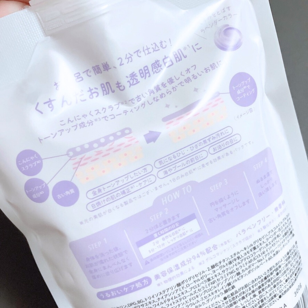 ボディも全身もまるごと透明感アップ! 🤍ブライトピュアクリームA ラベンダー・ホワイト 顔の白浮き対策や肌見せファッションで白く見せたいときや、日焼け止めとしてもOK✨ 美容保湿成分94%配合&肌に優しい天然由来のスクラブで毎日優しく使える!くすみを飛ばすこだわりのラベンダーカラーでワントーン明るくトーンアップできるよ! 自然な白肌*にしたいなら2分 しっかり白肌*にしたいなら5分〜10分置くのがおすすめ🫶🏻