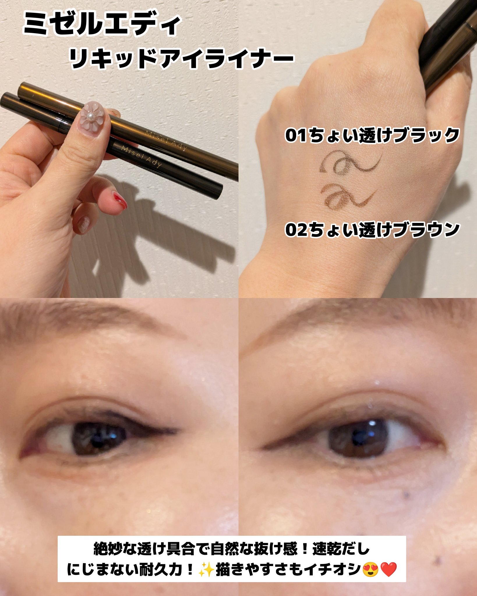 ちょい透け発色のリキッドアイライナーで、きちんとライン引いてもくっきりし過ぎない👍 自然な抜け感な仕上がりにしてくれるアイライナー💕 透け感が程良いので、ついついしっかり目にライン引いても強調し過ぎない仕上がりになってくれる🙆♀️ 筆もしなやかで、細いラインも引きやすく、描きやすい印象🙌 リピしたいアイライナーです💓