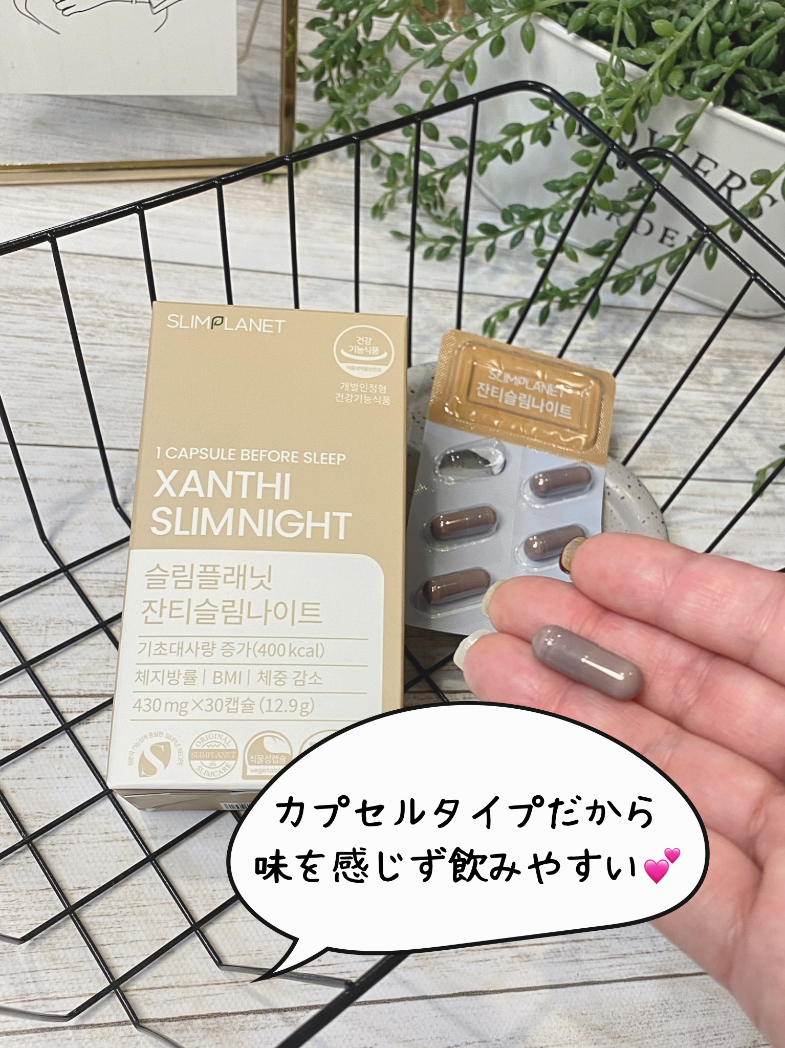 5種類のダイエットサポート成分配合(ワカメエキス、ザクロエキス、クロロゲン酸、トウモロコシのヒゲエキス、老いたカボチャエキス) 夜の時間にぴったりの設計です! 匂いもないので飲みやすいです。