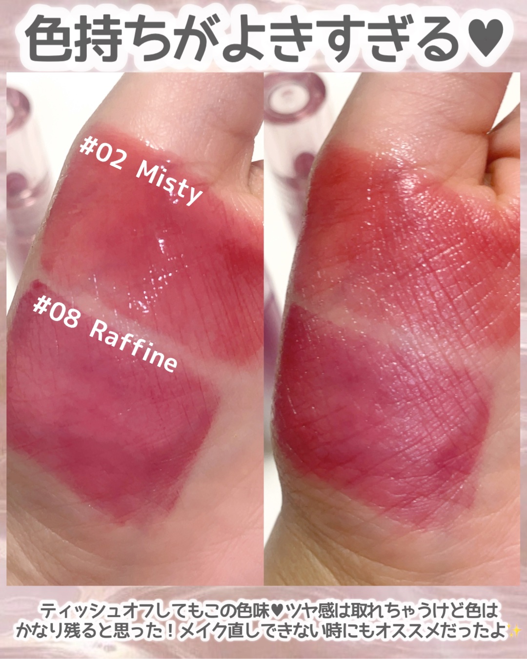 | ティント効果もばっちりでティッシュオフしてもしっかり残ってくれます! | 詳細を見る | |