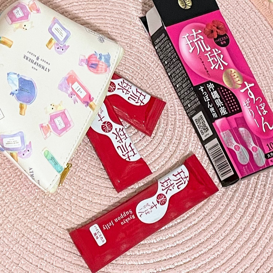 沖縄生まれのすっぽんぜりーは、コラーゲン・アミノ酸19種・ミネラル・不飽和脂肪酸・ビタミンB群などが手軽に摂れる、スティックタイプのゼリーだよ! 沖縄県産のすっぽんを使用していて、キレイと健康維持の成分がたっぷりはいってるんだって! 華やかな味わいの「ハイビスカス風味」は甘酸っぱくておいしい♡