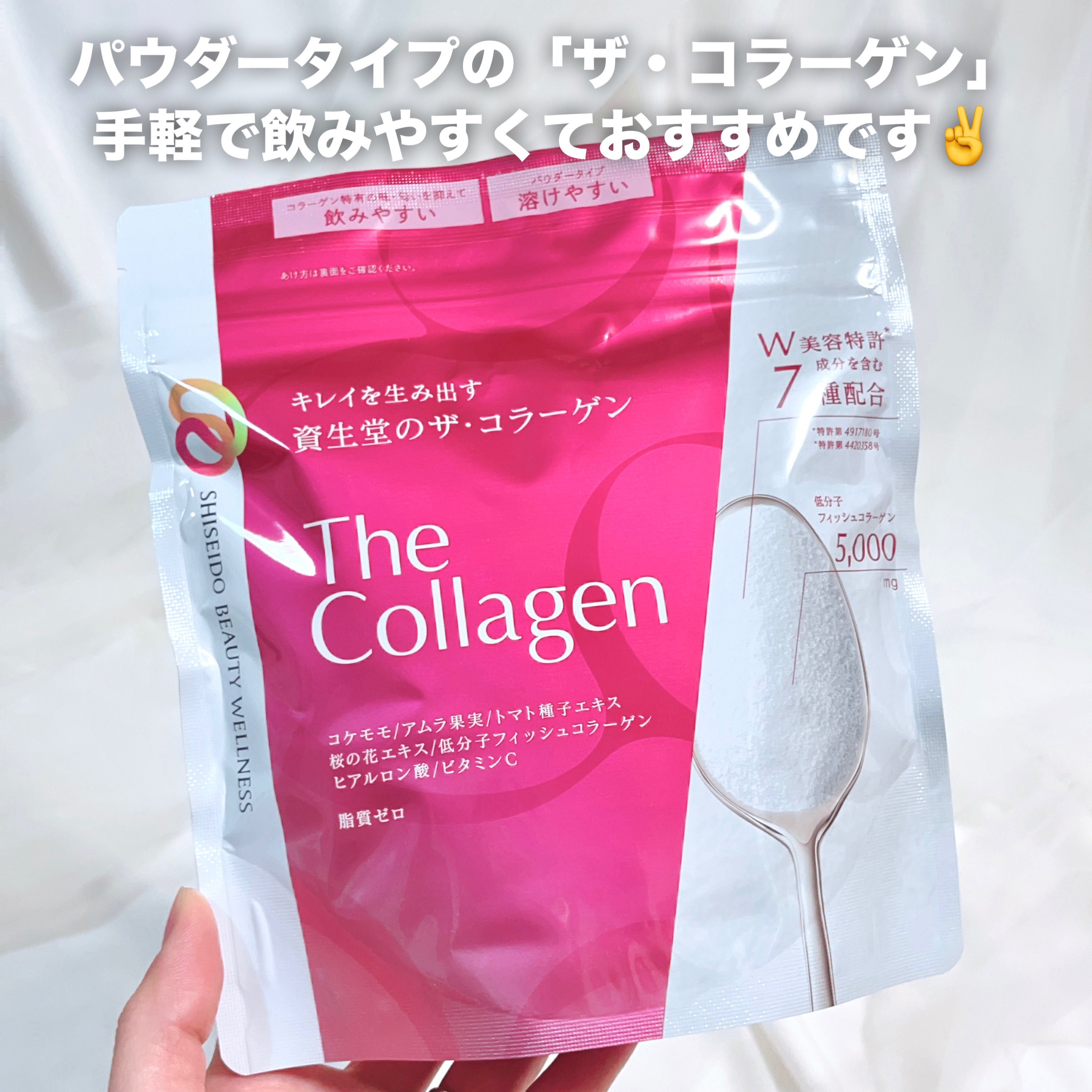 - 資生堂独自の W 美容特許成分を含む、7 種の美容成分を配合。 コラーゲン特有の味・匂いを抑えたパウダータイプで、毎日の食生活にキレイをプラス。