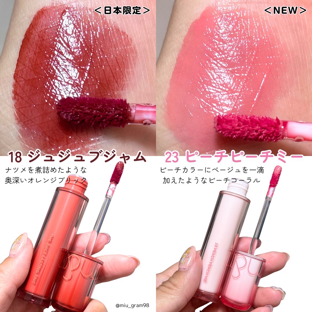 - ・全角度から分析とブラインドテストまで! 色味はもちろん、塗り心地、色もち、ツヤ感、仕上がりイメージなど様々な角度から比較分析とブラインドテストを経て作られました ・新しく誕生したザジューシー ! ジューシーラスティングティントでおなじみのツヤ感カラーはそのままで発色と持続力がさらにアップすることを実現しました ・クリアな光沢感 砂糖をコーティングしたような透き通るNEW光沢で輝く唇に ・全世界で愛されている JUICY LASTING TINTがリニューアル! ツヤ感UP・色もちUP!全てにおいてアップグレードされたことに加えて、果実を連想させる多彩なカラーバリエーションも注目ポイントです ・色だけじゃない!保湿も同時に 10種のヒアルロン酸(*)を配合 唇をしっとりと潤わせながら乾燥から守ります ・長時間ぷっくり仕上げをキープ 時間が経つにつれ、唇に密着!唇のしわをしっかりカバーしてくれます (*)ヒアルロン酸ジメチルシラノール、加水分解ヒアルロン酸、加水分解ヒアルロン酸Na、ヒアルロン酸、ヒアルロン酸K、ヒアルロン酸Na、ヒアルロン酸ヒドロキシプロピルトリモニウム、ヒアルロン酸クロスポリマーNa、ヒアルロン酸ジメチルシラノールNa、アセチルヒアルロン酸Na(すべて保湿成分) 2025年7月19日(土)(※1)より順次、全国のバラエティショップ・GMS・アインズ&トルペにて(※2)数量限定で発売します。 (※1)店頭開始日となり、購入可能日は各店舗によって異なります (※2) 一部店舗では取り扱いがない場合があります。