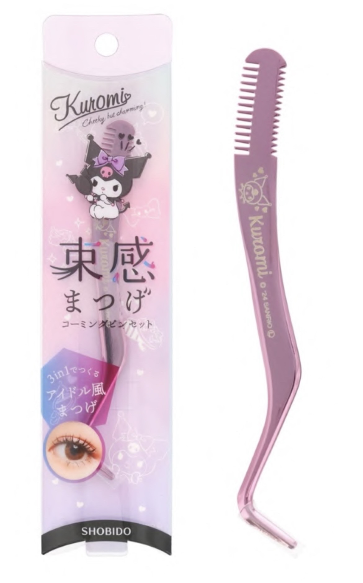 - 束感まつげを作るコーミングピンセット コーム付きのピンセットでアイドル風の束感まつげが簡単に! 「梳かす」「束ねる」「挟む」機能をひとつにまとめた3 in 1ツール ●トリミングコーム:メイク前のブラッシング、マスカラのダマ取りに ●ざっくりコーム:まつ毛をまとめて毛束を作る ●仕上げピン:ラウンド形状のピン先で安心!毛先をつまんで整える 【ご使用方法】 1.アイラッシュカーラーでまつげをカールさせた後、マスカラを適量塗布してください。 2.トリミングコームでマスカラのダマを取ります。 3.ざっくりコームをまつげの根元に当てて、左右に揺らします。束ができたら、毛先に向かってスッと抜いてください。 4.ピン部分で毛先を挟み、まつげの形や流れを整えます。 ※束になりにくい時は、ピンにマスカラを付けて毛束をまとめるとGOOD! 【お手入れ方法】 ご使用後は本体の汚れをティッシュペーパーなどで拭き取り、いつも清潔にご使用ください。 コーム部分についたマスカラが固まってしまった場合は、中性洗剤を薄く溶かしたぬるま湯にしばらく浸してから、軽く歯ブラシなどで洗い落とし、よくすすいだ後、水気を拭き取り保管してください。