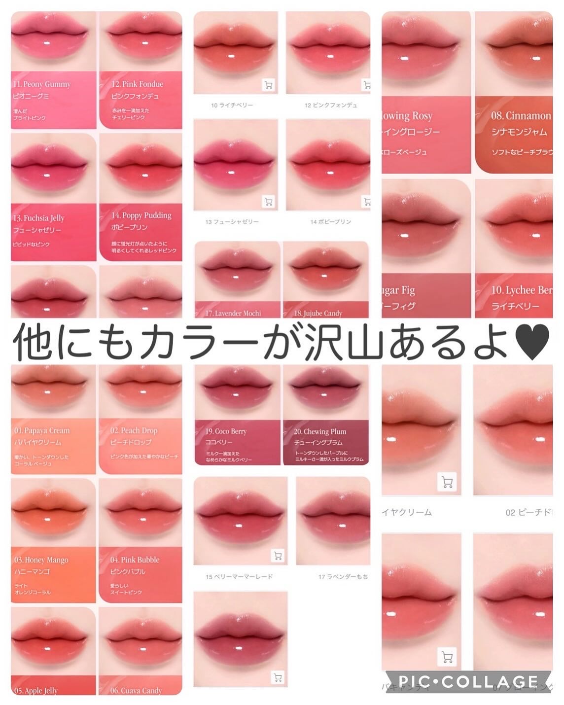 - <01 パパイヤクリーム> 水、ヘキサ(ヒドロキシステアリン酸/ステアリン酸/ロジン酸)ジペンタエリスリチル、トリエチルヘキサノイン、BG、グリセリン、オクチルドデカノール、ポリソルベート60、プロパンジオール、(PEG-240/デシルテトラデセス-20/HDI)コポリマー、1,2-ヘキサンジオール、セテアレス-20、フェノキシエタノール、エチルセルロース、カプリル酸グリセリル、(アクリル酸ヒドロキシエチル/アクリロイルジメチルタウリンNa)コポリマー、トリイソステアリン酸ポリグリセリル-2、リンゴ酸ジイソステアリル、酸化チタン、スクワラン、(アクリレーツ/アクリル酸アルキル(C10-30))クロスポリマー、トロメタミン、香料、エチルヘキシルグリセリン、黄4、赤104(1)、黄5、赤227、エチレンジアミンジコハク酸3Na、イソステアリン酸ソルビタン、ジイソステアリン酸ポリグリセリル-2、リナロール、ラウリン酸K、トコフェロール、青1 <02 ピーチドロップ> 水、ヘキサ(ヒドロキシステアリン酸/ステアリン酸/ロジン酸)ジペンタエリスリチル、トリエチルヘキサノイン、BG、グリセリン、オクチルドデカノール、ポリソルベート60、プロパンジオール、(PEG-240/デシルテトラデセス-20/HDI)コポリマー、1,2-ヘキサンジオール、セテアレス-20、フェノキシエタノール、リンゴ酸ジイソステアリル、酸化チタン、エチルセルロース、カプリル酸グリセリル、(アクリル酸ヒドロキシエチル/アクリロイルジメチルタウリンNa)コポリマー、トリイソステアリン酸ポリグリセリル-2、スクワラン、(アクリレーツ/アクリル酸アルキル(C10-30))クロスポリマー、トロメタミン、香料、エチルヘキシルグリセリン、黄5、赤104(1)、赤227、黄4、エチレンジアミンジコハク酸3Na、イソステアリン酸ソルビタン、ジイソステアリン酸ポリグリセリル-2、青1、リナロール、ラウリン酸K、トコフェロール <03 ハニーマンゴ> 水、ヘキサ(ヒドロキシステアリン酸/ステアリン酸/ロジン酸)ジペンタエリスリチル、トリエチルヘキサノイン、BG、グリセリン、オクチドデカノール、ポリソルベート60、プロパンジオール、(PEG-240/デシルテトラデセス-20/HDI)コポリマー、1,2-ヘキサンジオール、セテアレス-20、フェノキシエタノール、エチルセルロース、リンゴ酸ジイソステアリル、カプリル酸グリセリル、酸化チタン、(アクリル酸ヒドロキシエチル/アクリロイルジメチルタウリンNa)コポリマー、トリイソステアリン酸ポリグリセリル-2、スクワラン、(アクリレーツ/アクリル酸アルキル(C10-30))クロスポリマー、トロメタミン、香料、エチルヘキシルグリセリン、赤104(1)、黄5、赤227、黄4、エチレンジアミンジコハク酸3Na、イソステアリン酸ソルビタン、ジイソステアリン酸ポリグリセリル-2、リナロール、ラウリン酸K、トコフェロール、青1 <04 ピンクバブル> 水、ヘキサ(ヒドロキシステアリン酸/ステアリン酸/ロジン酸)ジペンタエリスリチル、トリエチルヘキサノイン、BG、グリセリン、オクチドデカノール、ポリソルベート60、プロパンジオール、(PEG-240/デシルテトラデセス-20/HDI)コポリマー、1,2-ヘキサンジオール、セテアレス-20、フェノキシエタノール、エチルセルロース、カプリル酸グリセリル、トリイソステアリン酸ポリグリセリル-2、(アクリル酸ヒドロキシエチル/アクリロイルジメチルタウリンNa)コポリマー、スクワラン、(アクリレーツ/アクリル酸アルキル(C10-30))クロスポリマー、リンゴ酸ジイソステアリル、酸化チタン、トロメタミン、香料、エチルヘキシルグリセリン、赤104(1)、酸化鉄、赤227、エチレンジアミンジコハク酸3Na、ジイソステアリン酸ポリグリセリル-2、黄4、イソステアリン酸ソルビタン、黄5、リナロール、ラウリン酸K、トコフェロール <05 アップルゼリー> 水、ヘキサ(ヒドロキシステアリン酸/ステアリン酸/ロジン酸)ジペンタエリスリチル、トリエチルヘキサノイン、BG、グリセリン、オクチドデカノール、ポリソルベート60、プロパンジオール、(PEG-240/デシルテトラデセス-20/HDI)コポリマー、1,2-ヘキサンジオール、セテアレス-20、フェノキシエタノール、トリイソステアリン酸ポリグリセリル-2、エチルセルロース、カプリル酸グリセリル、(アクリル酸ヒドロキシエチル/アクリロイルジメチルタウリンNa)コポリマー、スクワラン、(アクリレーツ/アクリル酸アルキル(C10-30))クロスポリマー、トロメタミン、香料、リンゴ酸ジイソステアリル、酸化チタン、エチルヘキシルグリセリン、赤227、黄5、赤104(1)、黄4、エチレンジアミンジコハク酸3Na、ジイソステアリン酸ポリグリセリル-2、イソステアリン酸ソルビタン、リナロール、ラウリン酸K、トコフェロール、青1 <06 クアバキャンディ> 水、ヘキサ(ヒドロキシステアリン酸/ステアリン酸/ロジン酸)ジペンタエリスリチル、トリエチルヘキサノイン、BG、グリセリン、オクチドデカノール、ポリソルベート60、プロパンジオール、(PEG-240/デシルテトラデセス-20/HDI)コポリマー、1,2-ヘキサンジオール、セテアレス-20、フェノ