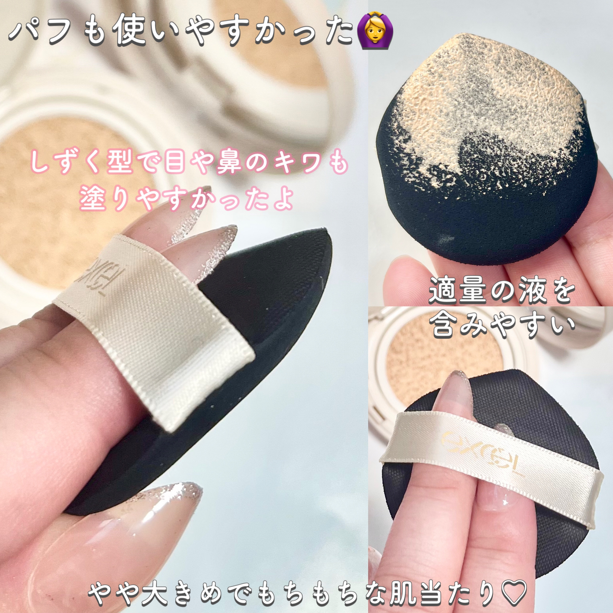 エクセルからブランド初のクッションファンデーションが誕生!! (今までなかったことに驚き…🫢) 美容液 73%配合で潤い感たっぷり💧 気になる赤みやクマや毛穴も程よくカバー! 艶が出る下地と一緒に使うとつやんつやんのお肌が簡単に出来上がるのでお気に入りになりました🫶