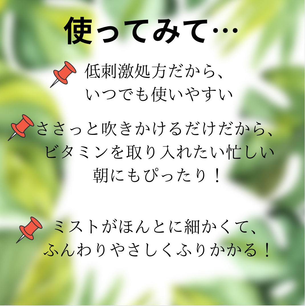 - CICA*1×ビタミン配合で、肌あれ・毛穴*2ケア! 乾燥トラブルを防ぐ消炎成分配合の薬用CICAミスト。 ふんわり微細ミストが角層まで浸透し、顔もからだも一気に速攻ビタミンチャージ。 やさしい使い心地で、あらゆる肌悩みをケアします。 *1ツボクサエキス・BG(保湿) *2毛穴目立ちのこと