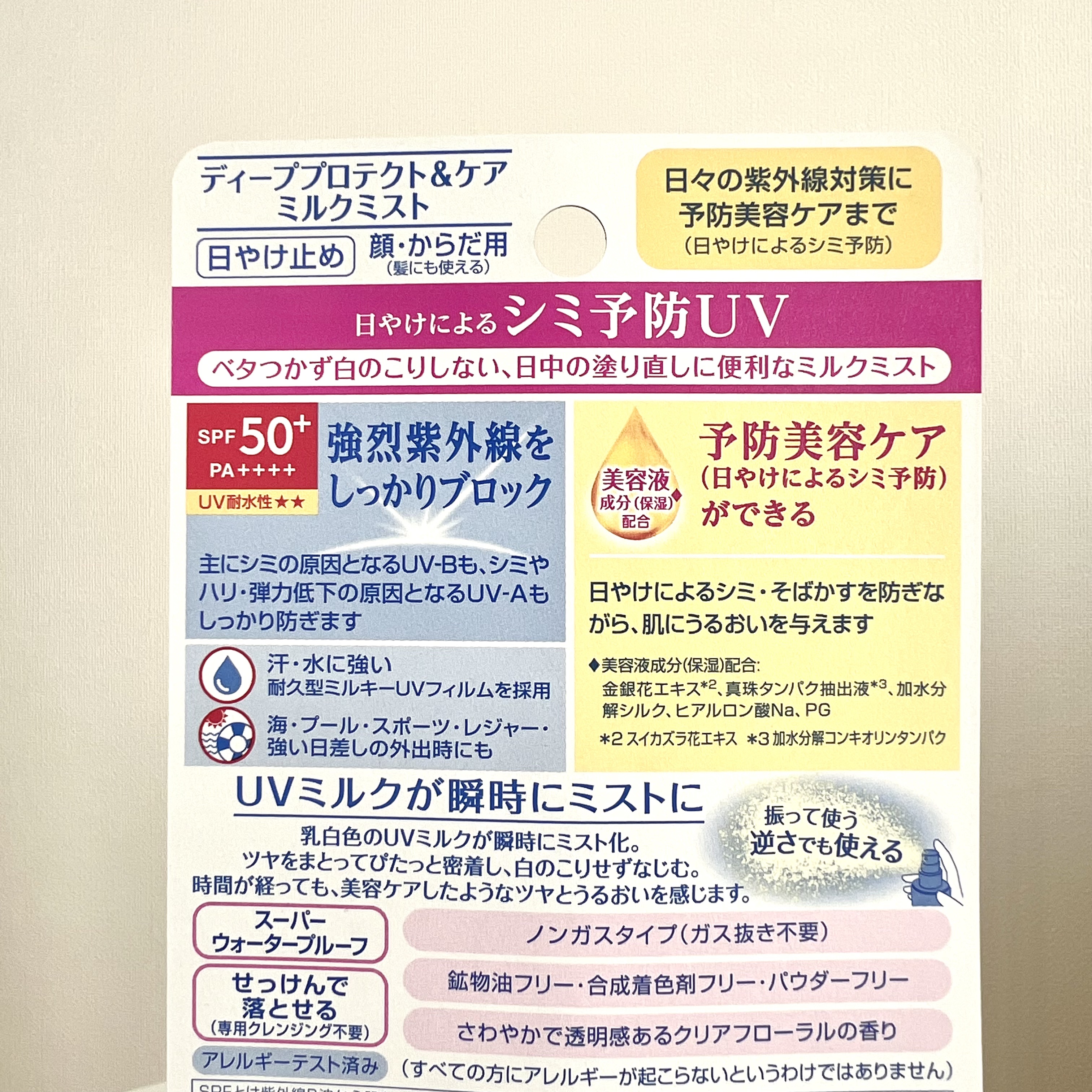 ニベア花王からいただきましたニベアUVディーププロテクト&ケアミルクミストをお試しさせていただきました。ミストタイプの日焼け止め。顔に塗る場合のみ、一度手に出してから塗ります。ミストタイプなので、身体に使う時はさっと使えて便利です。逆さでも使...