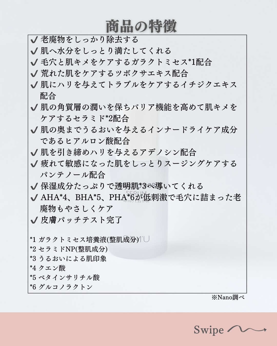 - ガラクトミセス発酵ろ過物配合し、やさしく、すっきりとしたテクスチャーのセラム。 粘着性がなく、なめらかで健康的な肌印象をサポートします。 繰り返し使用することで、毛穴のケアが期待でき、5つの保湿成分がしっとりとしたツヤ肌を実現します。 <特長成分> ガラクトミセス培養液: 低刺激の毛穴ケアをサポート(整肌成分) *AHA+BHA+PHA: 毛穴の詰まりや古い角質をやさしくケア(整肌成分) ツボクサ葉/茎エキス (CICA): 敏感になった肌を穏やかに整えます(整肌成分) ヒアルロン酸: 肌に潤いを与え、保湿をサポート(保湿成分) *AHA(アルファヒドロキシ酸)は、一般的には「グリコール酸」や「乳酸」などの酸の名称で表記されます。 BHA(ベータヒドロキシ酸)は、「サリチル酸」として表記されます PHA(ポリヒドロキシ酸)は、「グルコノラクトン」として表記されます <テクスチャー&香り> テクスチャー しっとりしながらもべたつかない爽やかなセラムテクスチャー。 香り シトラスフローラルの香りが、爽やかで心地よいケアタイムを提供。
