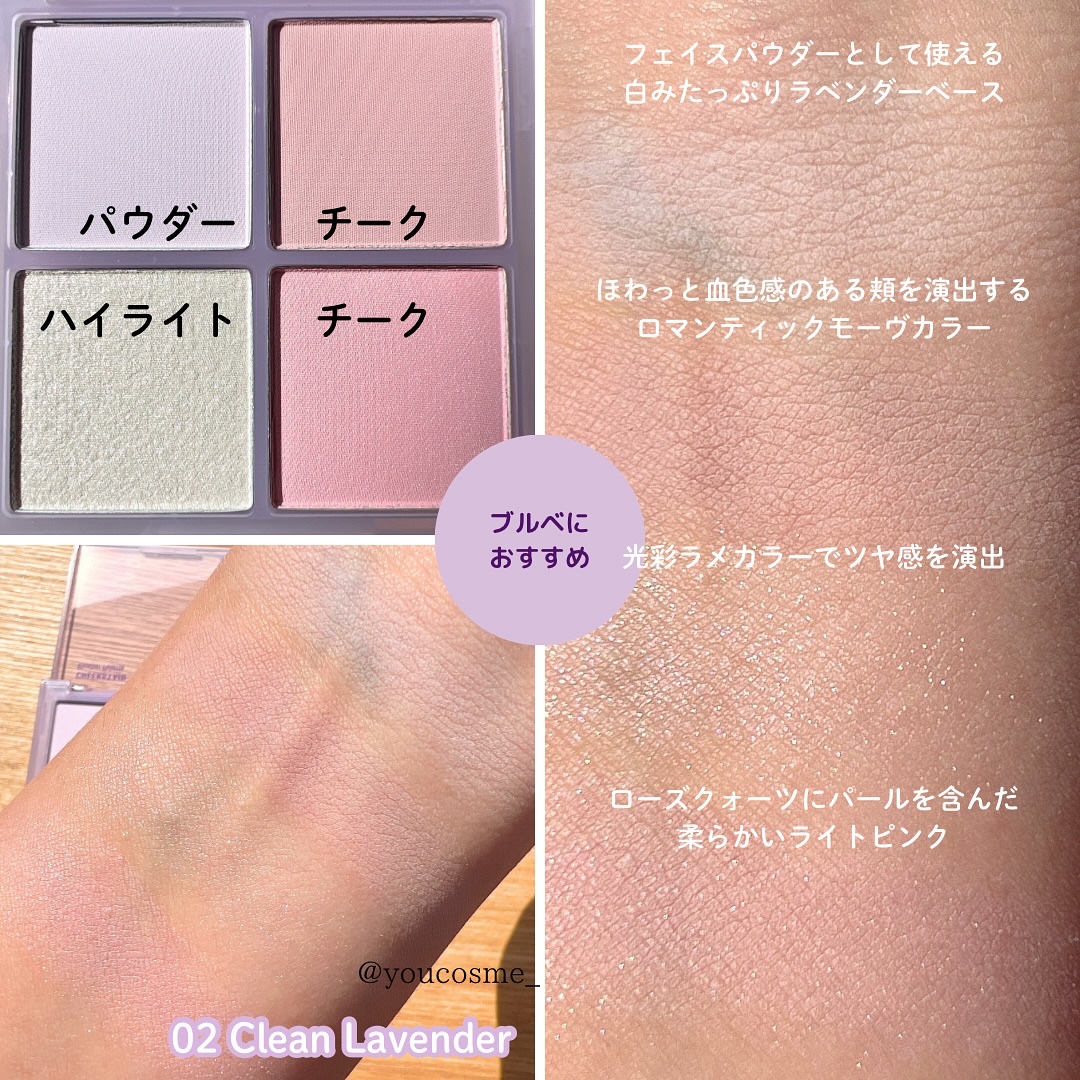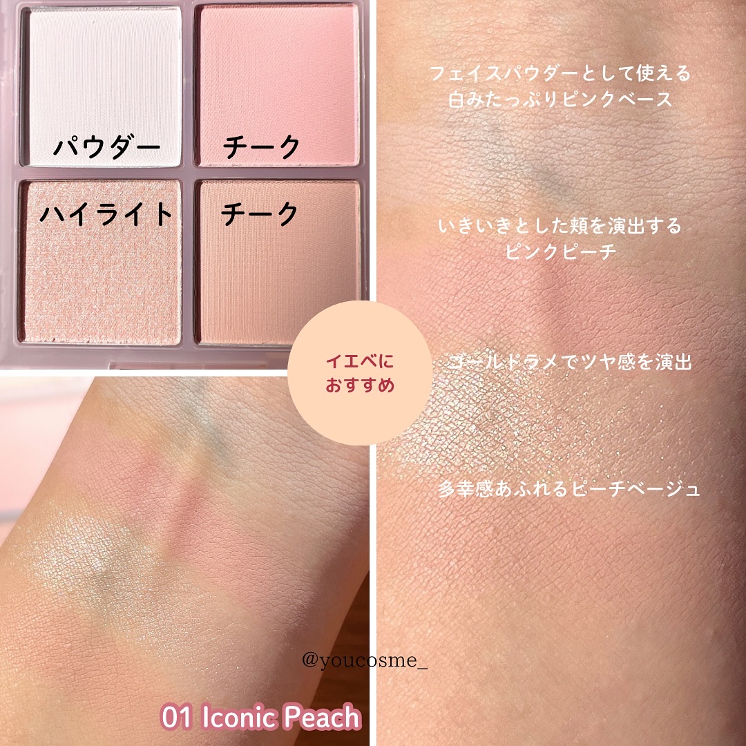 トーンアップと立体感を演出する4色パレット𓂃🌸 マットパウダーはフェイスパウダーだけではなくマットハイライターとして明るさを演出💓 ハイライトカラーは、チークカラーの上から重ねることで立体感のある顔になるよ🧏🏻♀️✨ イエベメイクとブルベメイクでこんなに印象変わるんだね🤭💄