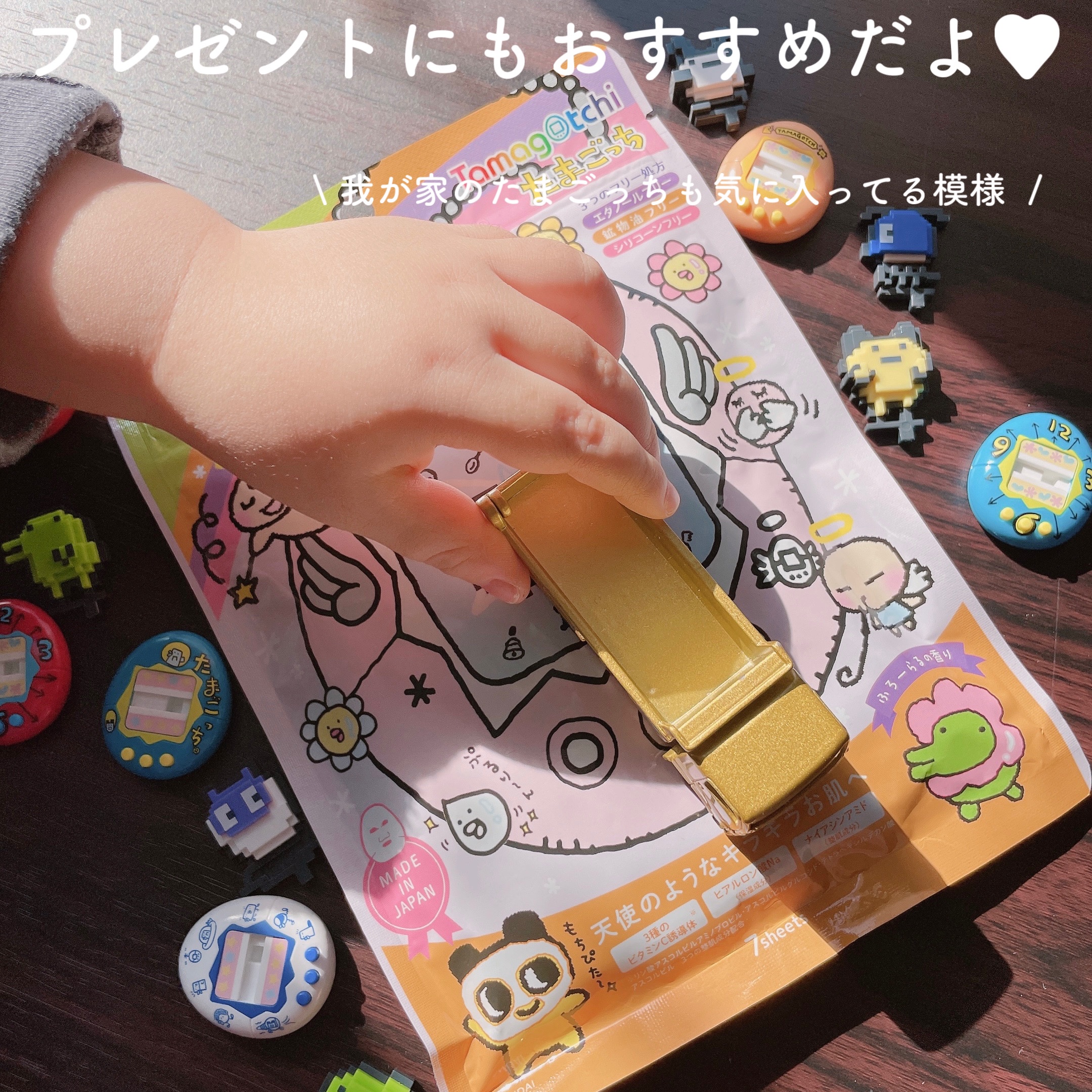可愛すぎるパケのフェイスマスク!2種類あったのですが、昔使ってたピンクの天使っちたまごっちのパケを選びました🩷 潤いたっぷりのぷるりんお肌に導く「もちぴたつつまれマスク」シリーズからたまごっちのフェイスマスクが新登場! 美容液がひたひただし、シートにちゃんと切り込みも入ってるので顔にフィットする♡香りもきつすぎないほのかなふろーらるの香り🌼