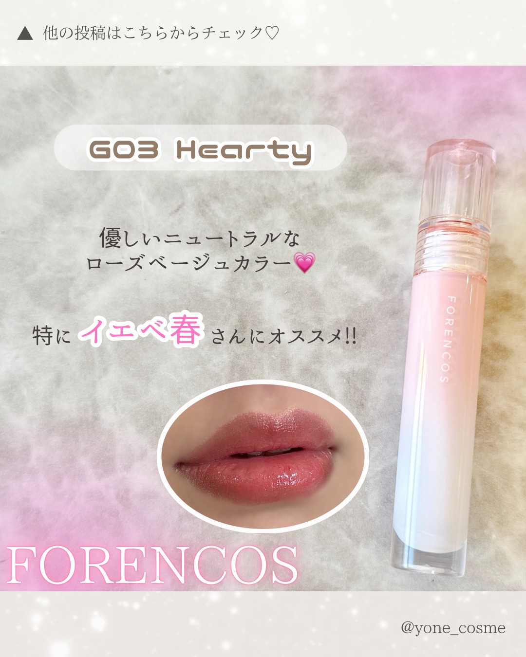 軽いテクスチャで透き通るように輝く水光ティント。 このリップ、色持ちが本当に良い🥺♡ 9色展開だから自分にピッタリな色が見つかるよ◎ イエベ春のわたしは03 ハーティーが可愛くて推しカラー。