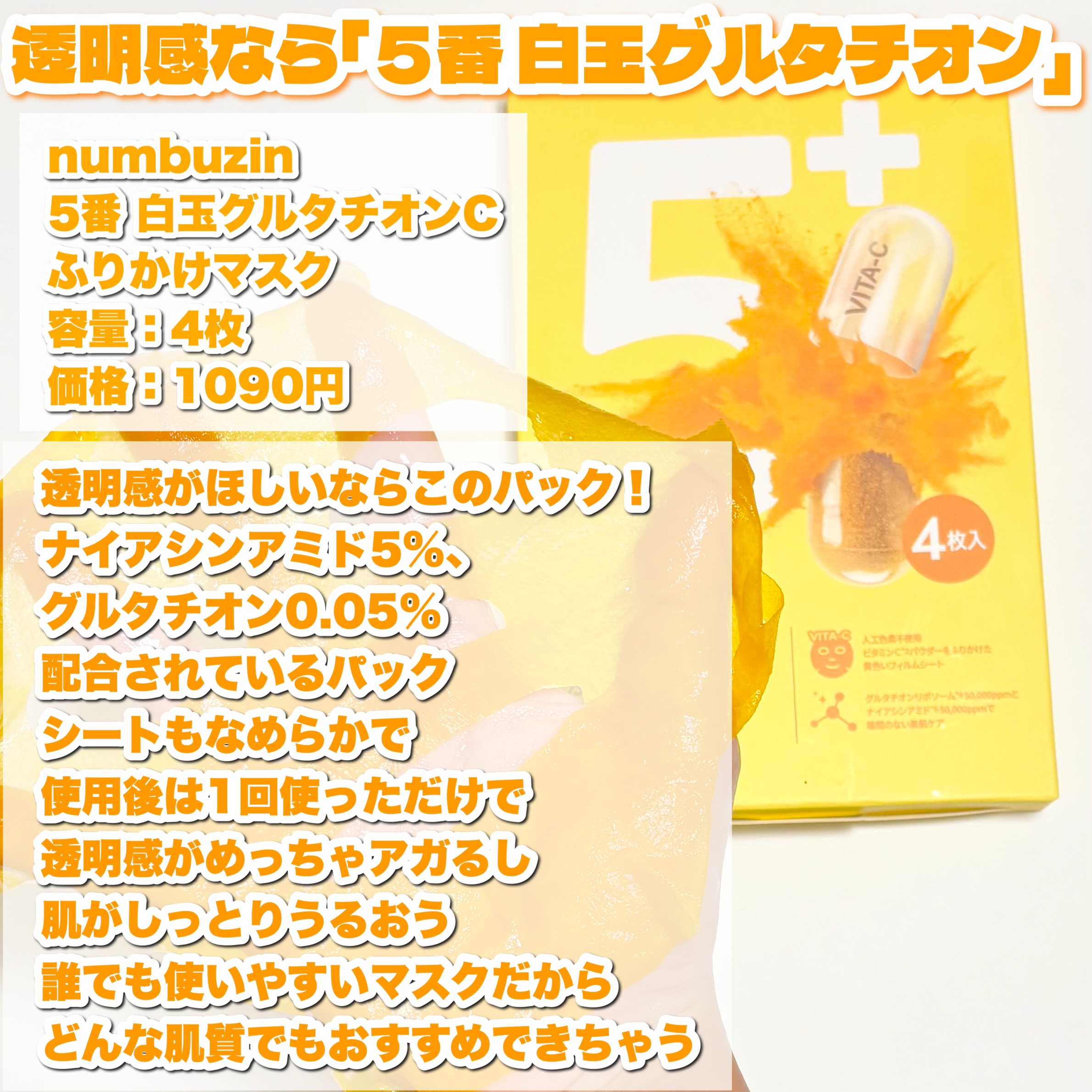ナンバーズインnumbuzinのパックはいつも家にあります🏡とにかく使いやすい👏使い心地もそうだし、値段的にも買いやすい😁✼••┈┈••✼••┈┈••✼••┈┈••✼••┈┈••✼5番 白玉グルタチオンCふりかけマスク肌のくすみが気になってる...