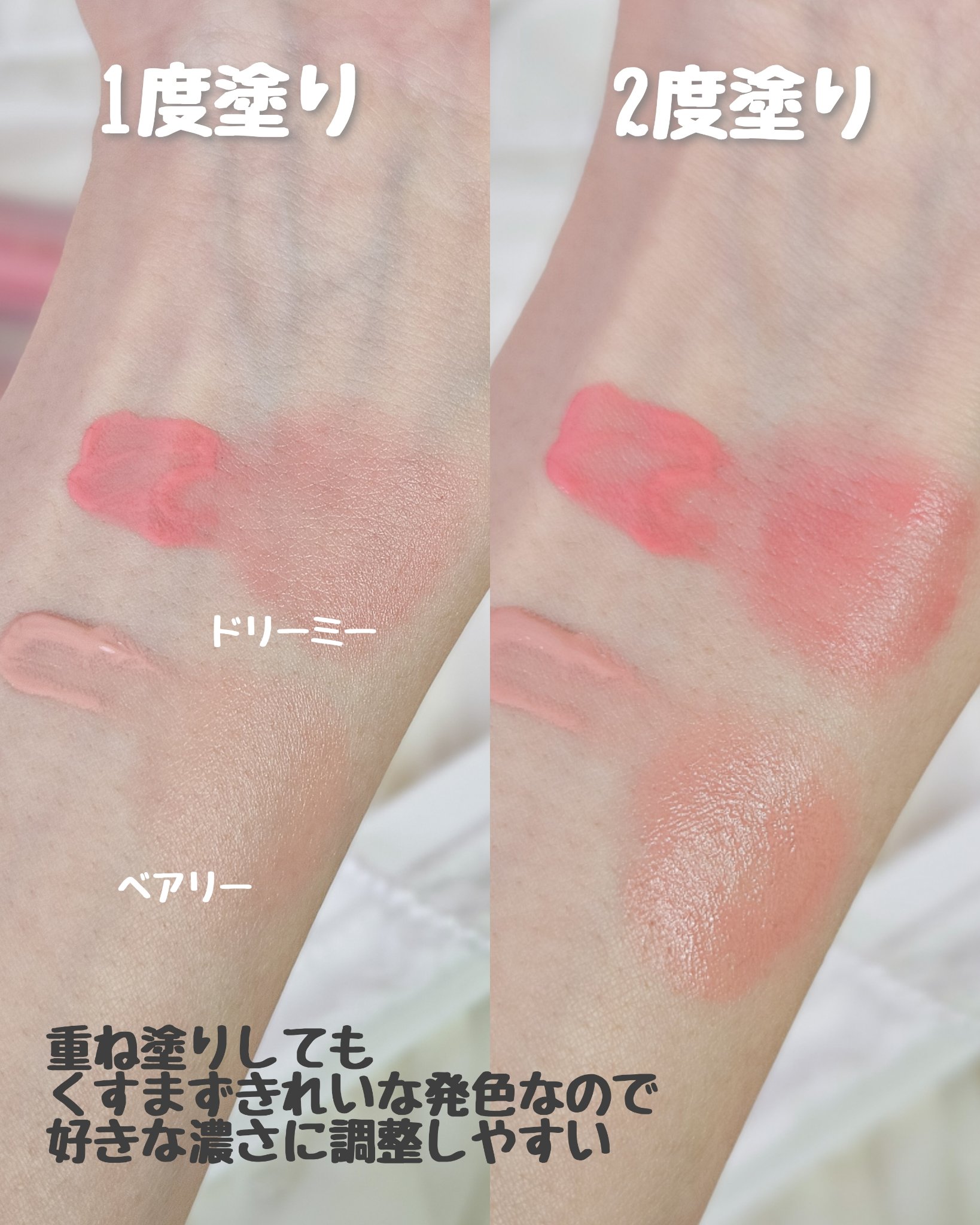 テクスチャーは保湿力があり滑らかで お肌にのせるとほわっとした質感で肌馴染みが良いので つけ心地が軽くお肌の負担が少ないのと、ほしい色味が揃ってるので使いやすいです🌸