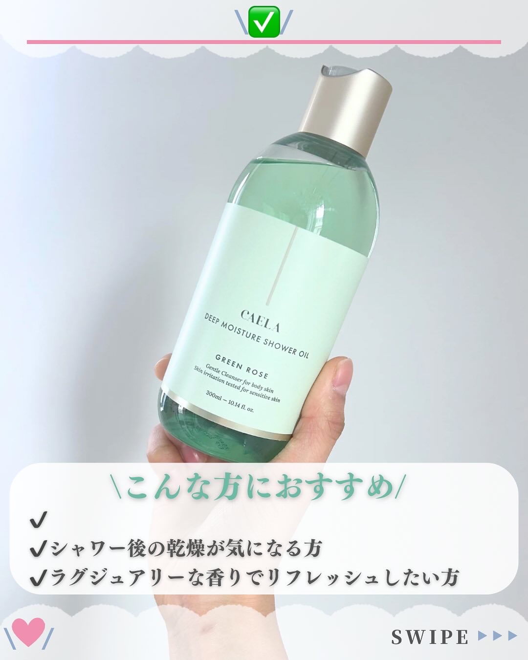 きめ細やかな泡の高保湿なシャワーオイル いつものバスタイムで肌が乾燥する方におすすめです🛀 pH5.5の微酸性フォーミュラで肌に優しい洗える🫧 植物性のオイルを配合したジェルが水と混ざり合いきめ細かな泡となって優しくしっとりと洗い上げます フレッシュなグリーンとダマスクローズの優雅な香りで毎日を特別な瞬間に🌹