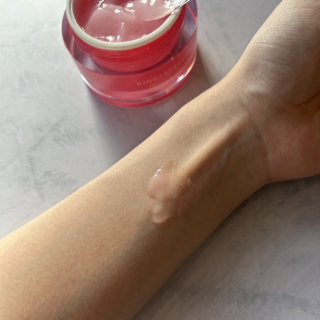 さっと塗って寝るだけで仕込む毎朝の”メイクノリいい”クリーム🍓 ヒンス初のスキンケアラインは、ビタミンと抗酸化成分が豊富な「キングスベリー」に着目して開発! 約72%以上のキングスベリー水とビタミンを配合✨肌トーン、キメ、ツヤを改善して朝に”メイクノリいい”お肌に仕上げてくれるんだそう🫶 ぷるんぷるんのジェル状のクリーム!粒々したものが見えますが、これはビタミンたっぷりカプセルなんだとか!