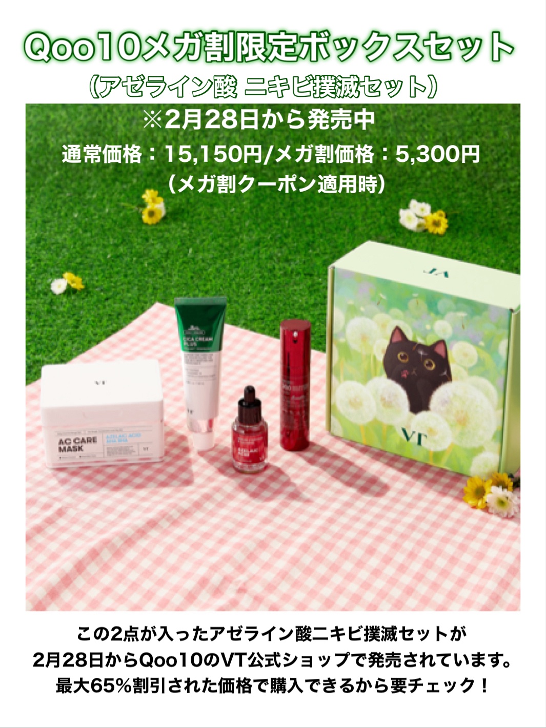 \メガ割限定!VTアゼライン酸セット/VTQoo10メガ割限定ボックスセットアゼライン酸ニキビ撲滅セット通常価格:15,150円/メガ割価格:5,300円(メガ割クーポン適用時)Qoo10メガ割で、VTの特別なセットが発売中✨ ▶︎A1カーミ...
