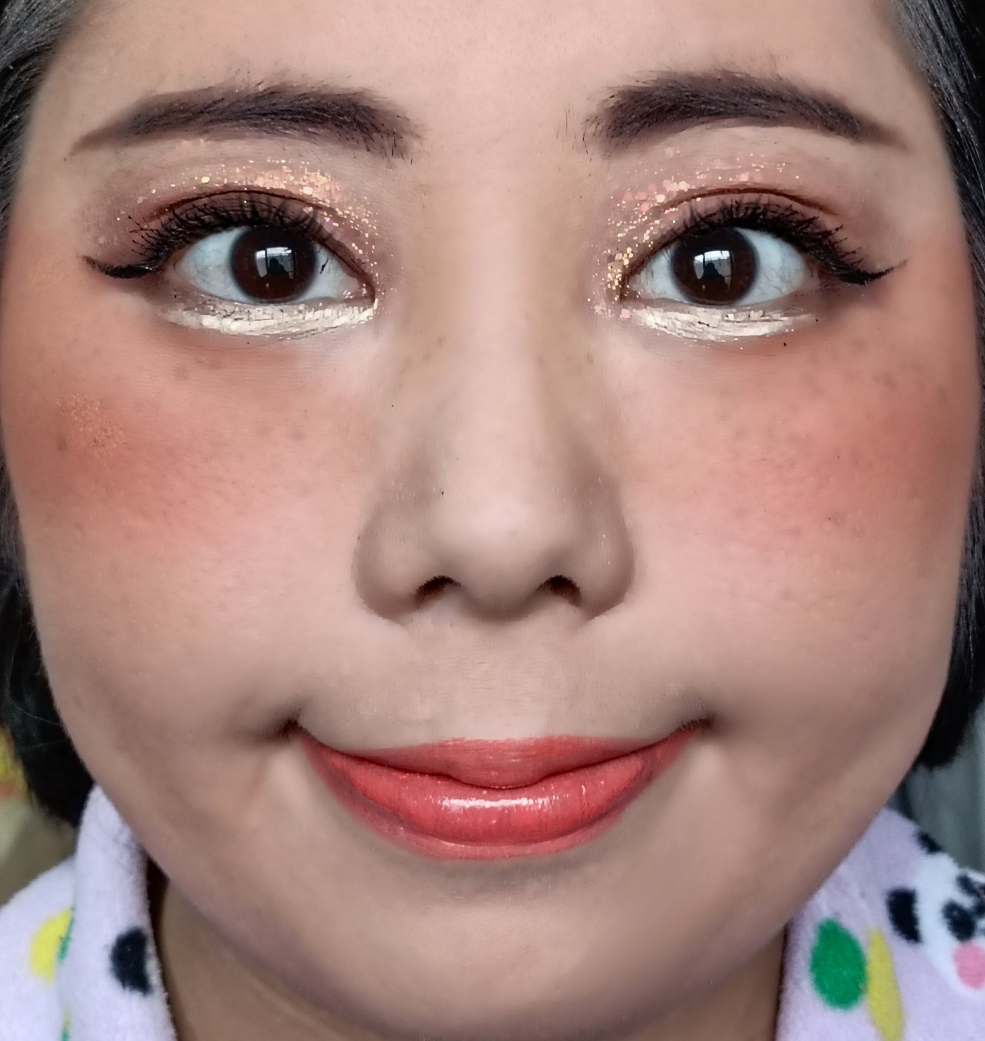 アリィー ニュアンスチェンジUV ジェル RSを、顔全体にまんべんなく塗ります。 RMK RMK ジェルクリーミィファンデーション 103を、顔全体にまんべんなく塗ります。 ジョンソンベビー ジョンソン ベビーパウダーを、顔全体にまんべんなく軽くはたきます。 THE BODY SHOP bronze shade warm glowを、両頬に塗ります。 KATE リフレクトミラーアイズ BR-1の締め色を、眉毛全体にまんべんなく塗ります。 URGLAM UR GLAMBLOOMING EYE COLOR PALETTE 01を、使用しました。 ちふれ リキッド アイライナー 筆ペンタイプ BK30 ブラックを、塗ります。 CEZANNE エアリーカールマスカラを、まつ毛全体にまんべんなく塗ります。 MAYBELLINE NEW YORK コロッサルボリュームエクスプレスを、まつ毛全体にまんべんなく塗ります。 MAYBELLINE NEW YORK SPステイ マットインク 135を、唇全体にまんべんなく塗ります。