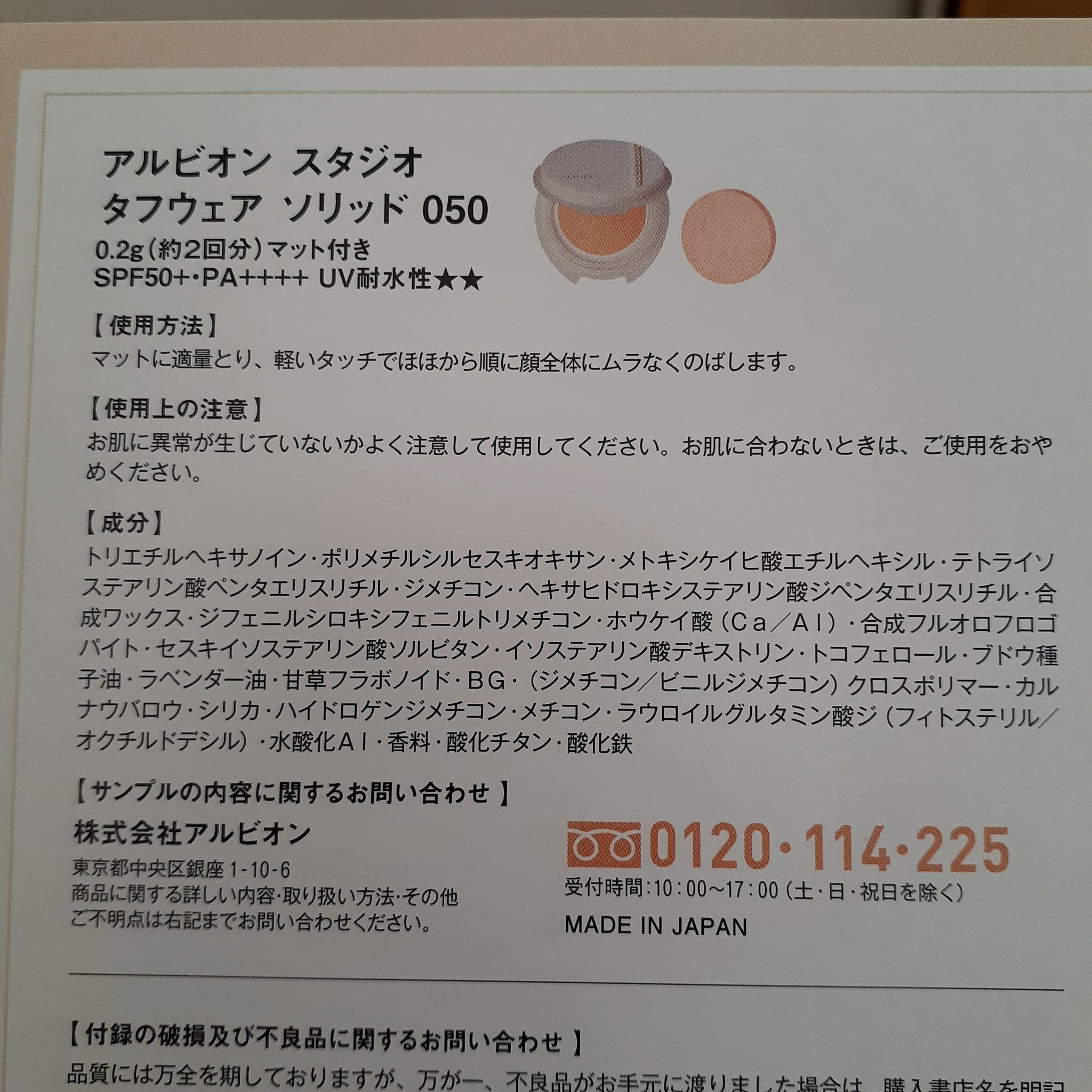 アルビオン♡アルビオンスタジオタフウェアソリッドサンプル品いだきました! 普段ノーファンデの私が使用してみて(個人さはあるかと思います。)カラーは標準色50を使用仕上がりがとてもキレイ!カバー力はそこまでないけど毛穴凸凹が消えたことに驚いた!...