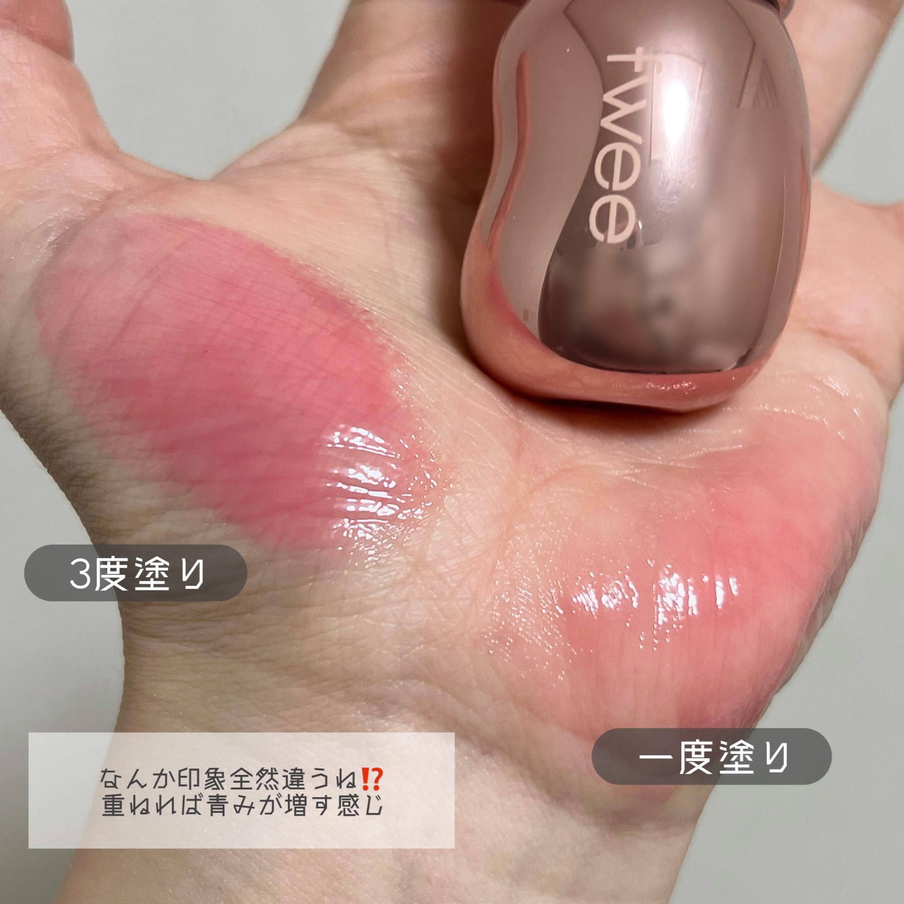 fweeの新色「ピーチ」💗 メガ割でfweeアイテム3000円以上購入者限定(数量限定)でピーチ70%が貰えるとの情報を知り、、、もちろんゲットしちゃいました~!!✨ 一番似てるバニラよりピンク感強めのコーラルピンクカラー💗 イエベ、ブルベ関係なく使いやすいピンクかな?という印象。 とにかく色味が天才的!! 本当にfweeはめちゃくちゃセンスある。(誰)