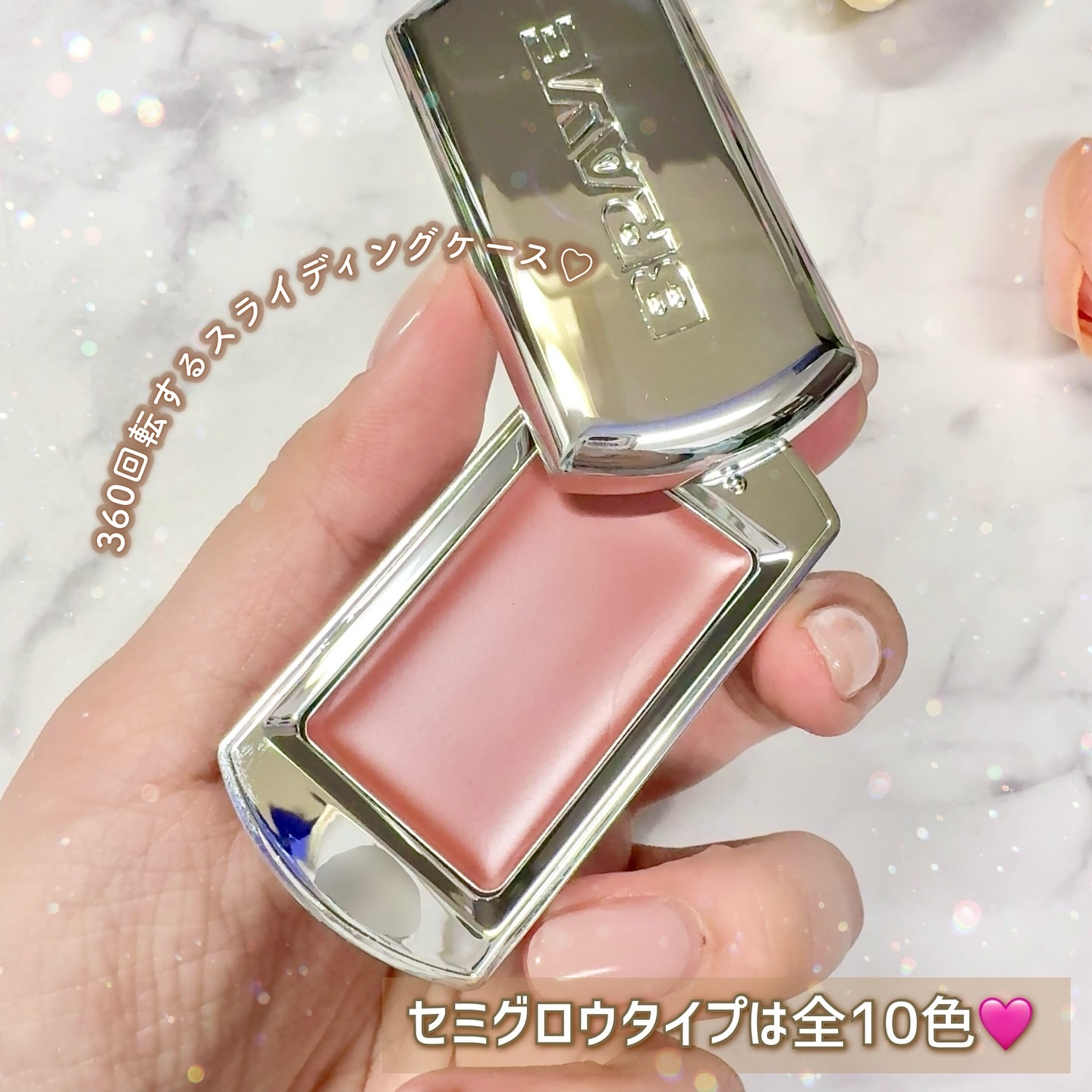 \かわいすぎて事件🤯💘⚡️濡れツヤハイライト/ 上品でキラキラのツヤが美しすぎると発売前から話題でしたね🙌 エナメル+キルティング加工のケースはツルツルぷにぷに♬ 薄型なので持ち運びにも便利!かわいいので無駄に持ち歩こう🙋♀️(?) 細かなピンクパールが温かみのあるツヤを演出してくれます💗 とてもしっとりしたパウダーで粉感がなく、繊細な輝きが長続きします👏 大粒の偏光ラメがギラギラ🤩🥳祭りじゃ〜!といった感じ笑 ホワイトカラーで輝きが目立つので濡れたようなツヤ感が出ます✨ マスクメイクでも頬骨より少し上のCゾーンに入れれば隠れずツヤ感が綺麗に映えます🥰 ラメが大粒で強いのでアイメイクの仕上げに入れても💮 結果万能なのとちょっと奇抜なの♥️ 両方文句なしにかわいかったので満足です🧚♀️笑