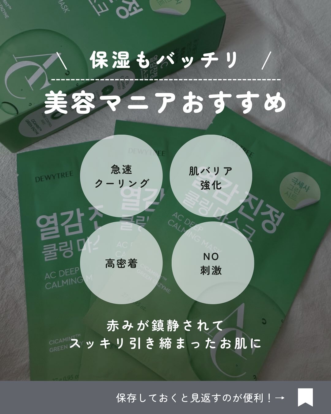 DEWYTREEACディープ熱感カーミングマスク肌には熱感鎮静ケアが必須!!ほてり感ををほどよく刺激を素早く鎮めて透明感のあるしっとりしたお肌に仕上げるデューイーツリーACラインシカとペパーミントが合わさった、デューイーツ...