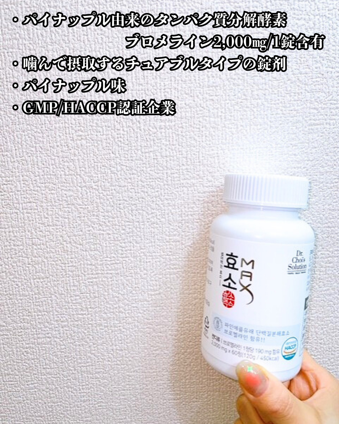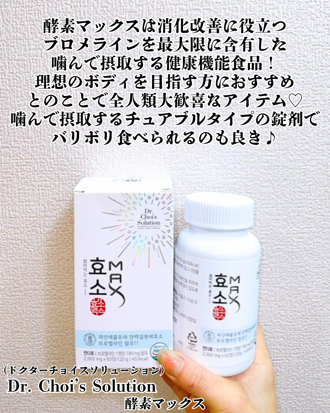 **こんにちは!美容大好きむうです!今回はDr.Choi'sSolutionの『酵素MAX』消化改善に役立つブロメラインを最大限に含有している噛んで摂取する健康機能食品✨パイナップル味のラムネみたいな美味しいサプリで、食前もしくは食後に食べる...