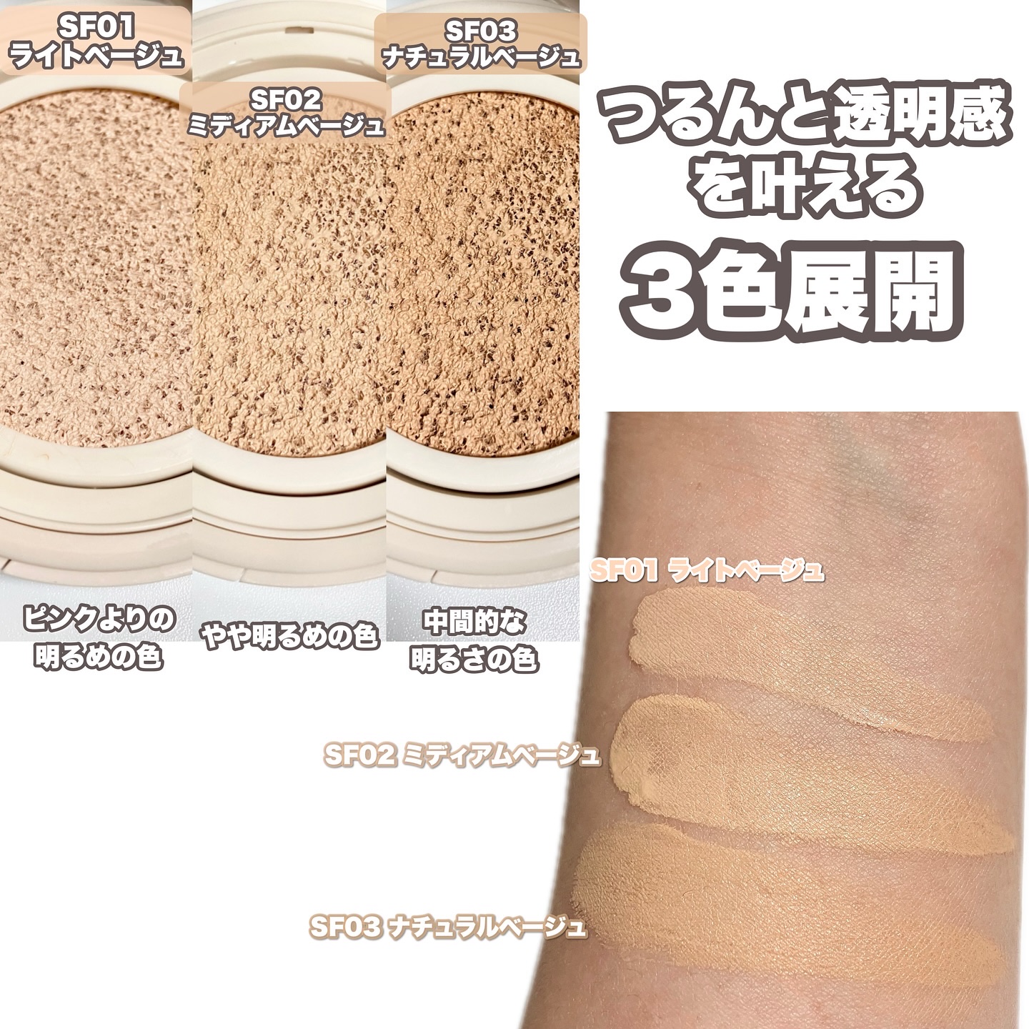 - <SF01 ライトベージュ(本体)> ジメチコン、水、酸化チタン、酸化亜鉛、BG、グリセリン、ジフェニルシロキシフェニルトリメチコン、ジカプリン酸ネオペンチルグリコール、メトキシケイヒ酸エチルヘキシル、PEG-10ジメチコン、キシリトール、イソステアリン酸、PEG-32、パルミチン酸アスコルビルリン酸3Na、ナイアシンアミド、グリシルグリシン、セラミドNG、セラミドNP、セラミドAP、セルロース、EDTA-2Na、キサンタンガム、クオタニウム-18ヘクトライト、ステアリン酸Mg、セスキイソステアリン酸ソルビタン、トリメチルシロキシケイ酸、ノイバラ果実エキス、ハイドロゲンジメチコン、フィトステロールズ、ラウロイルグルタミン酸Na、リシン、塩化Mg、水酸化Al、水添レシチン、硫酸Mg、フェノキシエタノール、マイカ、合成フルオロフロゴパイト、酸化鉄 <SF02 ミディアムベージュ(本体)> ジメチコン、水、酸化チタン、酸化亜鉛、BG、グリセリン、ジフェニルシロキシフェニルトリメチコン、ジカプリン酸ネオペンチルグリコール、メトキシケイヒ酸エチルヘキシル、PEG-10ジメチコン、キシリトール、イソステアリン酸、PEG-32、パルミチン酸アスコルビルリン酸3Na、ナイアシンアミド、グリシルグリシン、セラミドNG、セラミドNP、セラミドAP、セルロース、EDTA-2Na、キサンタンガム、クオタニウム-18ヘクトライト、ステアリン酸Mg、セスキイソステアリン酸ソルビタン、トリメチルシロキシケイ酸、ノイバラ果実エキス、ハイドロゲンジメチコン、フィトステロールズ、ラウロイルグルタミン酸Na、リシン、塩化Mg、水酸化Al、水添レシチン、硫酸Mg、フェノキシエタノール、マイカ、合成フルオロフロゴパイト、酸化鉄 <SF03 ナチュラルベージュ(本体)> ジメチコン、水、酸化チタン、酸化亜鉛、BG、グリセリン、ジフェニルシロキシフェニルトリメチコン、ジカプリン酸ネオペンチルグリコール、メトキシケイヒ酸エチルヘキシル、PEG-10ジメチコン、キシリトール、イソステアリン酸、PEG-32、パルミチン酸アスコルビルリン酸3Na、ナイアシンアミド、グリシルグリシン、セラミドNG、セラミドNP、セラミドAP、セルロース、EDTA-2Na、キサンタンガム、クオタニウム-18ヘクトライト、ステアリン酸Mg、セスキイソステアリン酸ソルビタン、トリメチルシロキシケイ酸、ノイバラ果実エキス、ハイドロゲンジメチコン、フィトステロールズ、ラウロイルグルタミン酸Na、リシン、塩化Mg、水酸化Al、水添レシチン、硫酸Mg、フェノキシエタノール、マイカ、合成フルオロフロゴパイト、酸化鉄 <SF01 ライトベージュ(リフィル)> ジメチコン、水、酸化チタン、酸化亜鉛、BG、グリセリン、ジフェニルシロキシフェニルトリメチコン、ジカプリン酸ネオペンチルグリコール、メトキシケイヒ酸エチルヘキシル、PEG-10ジメチコン、キシリトール、イソステアリン酸、PEG-32、パルミチン酸アスコルビルリン酸3Na、ナイアシンアミド、グリシルグリシン、セラミドNG、セラミドNP、セラミドAP、セルロース、EDTA-2Na、キサンタンガム、クオタニウム-18ヘクトライト、ステアリン酸Mg、セスキイソステアリン酸ソルビタン、トリメチルシロキシケイ酸、ノイバラ果実エキス、ハイドロゲンジメチコン、フィトステロールズ、ラウロイルグルタミン酸Na、リシン、塩化Mg、水酸化Al、水添レシチン、硫酸Mg、フェノキシエタノール、マイカ、合成フルオロフロゴパイト、酸化鉄 <SF02 ミディアムベージュ(リフィル)> ジメチコン、水、酸化チタン、酸化亜鉛、BG、グリセリン、ジフェニルシロキシフェニルトリメチコン、ジカプリン酸ネオペンチルグリコール、メトキシケイヒ酸エチルヘキシル、PEG-10ジメチコン、キシリトール、イソステアリン酸、PEG-32、パルミチン酸アスコルビルリン酸3Na、ナイアシンアミド、グリシルグリシン、セラミドNG、セラミドNP、セラミドAP、セルロース、EDTA-2Na、キサンタンガム、クオタニウム-18ヘクトライト、ステアリン酸Mg、セスキイソステアリン酸ソルビタン、トリメチルシロキシケイ酸、ノイバラ果実エキス、ハイドロゲンジメチコン、フィトステロールズ、ラウロイルグルタミン酸Na、リシン、塩化Mg、水酸化Al、水添レシチン、硫酸Mg、フェノキシエタノール、マイカ、合成フルオロフロゴパイト、酸化鉄 <SF03 ナチュラルベージュ(リフィル )> ジメチコン、水、酸化チタン、酸化亜鉛、BG、グリセリン、ジフェニルシロキシフェニルトリメチコン、ジカプリン酸ネオペンチルグリコール、メトキシケイヒ酸エチルヘキシル、PEG-10ジメチコン、キシリトール、イソステアリン酸、PEG-32、パルミチン酸アスコルビルリン酸3Na、ナイアシンアミド、グリシルグリシン、セラミドNG、セラミドNP、セラミドAP、セルロース、EDTA-2Na、キサンタンガム、クオタニウム-18ヘクトライト、ステアリン酸Mg、セスキイソステアリン酸ソルビタン、トリメチルシロキシケイ酸、ノイバラ果実エキス、ハイドロゲンジメチコン、フィトステロールズ、ラウロイルグルタミン
