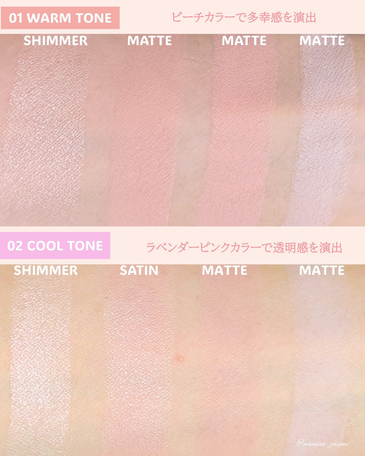 01がイエベ、02がブルベに対応しているそう💡 なじみがいいので、01でもいいですが、馴染み過ぎてしまうカラーもあり チークはもちろん、ハイライト、フェイスパウダーもこれ1つで使えるところが便利でいいです。
