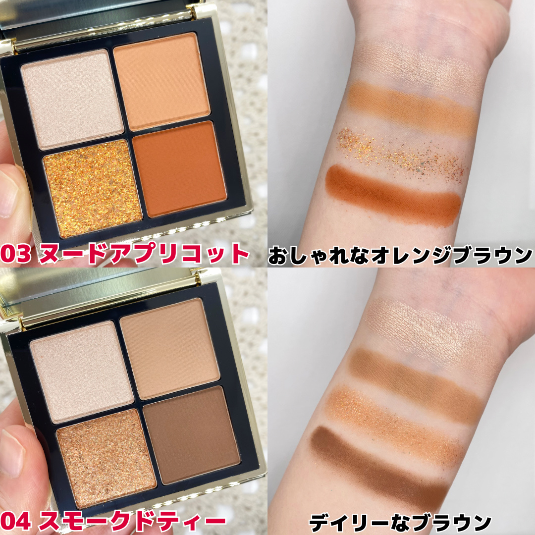 高発色だけどシアーで 粉質も柔らかく肌に密着してくれるアイシャドウ マットカラー2色、ハイライトカラー1色 グリッター1色、の4色パレット 個人的にやっぱり使いやすい04がお気に入り