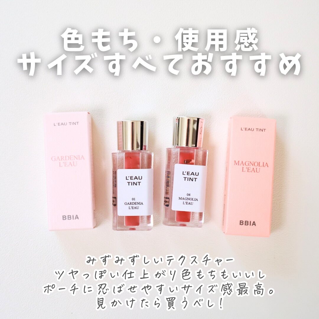 - - うるおいリップなのにしっかりカラーが定着し、時間が経っても塗りたてそのままのカラーを維持 *色が落ちにくいことから「飲み会リップ」としてSNSで話題に - 水のように軽くて快適なグロウティント、塗り重ねるほど鮮やかで透明に浮き上がる水彩画カラー - 香水瓶をイメージしたBBIA初のカスタムデザイン。パッケージはもちろん、カラーとテクスチャーに真心を込めて開発