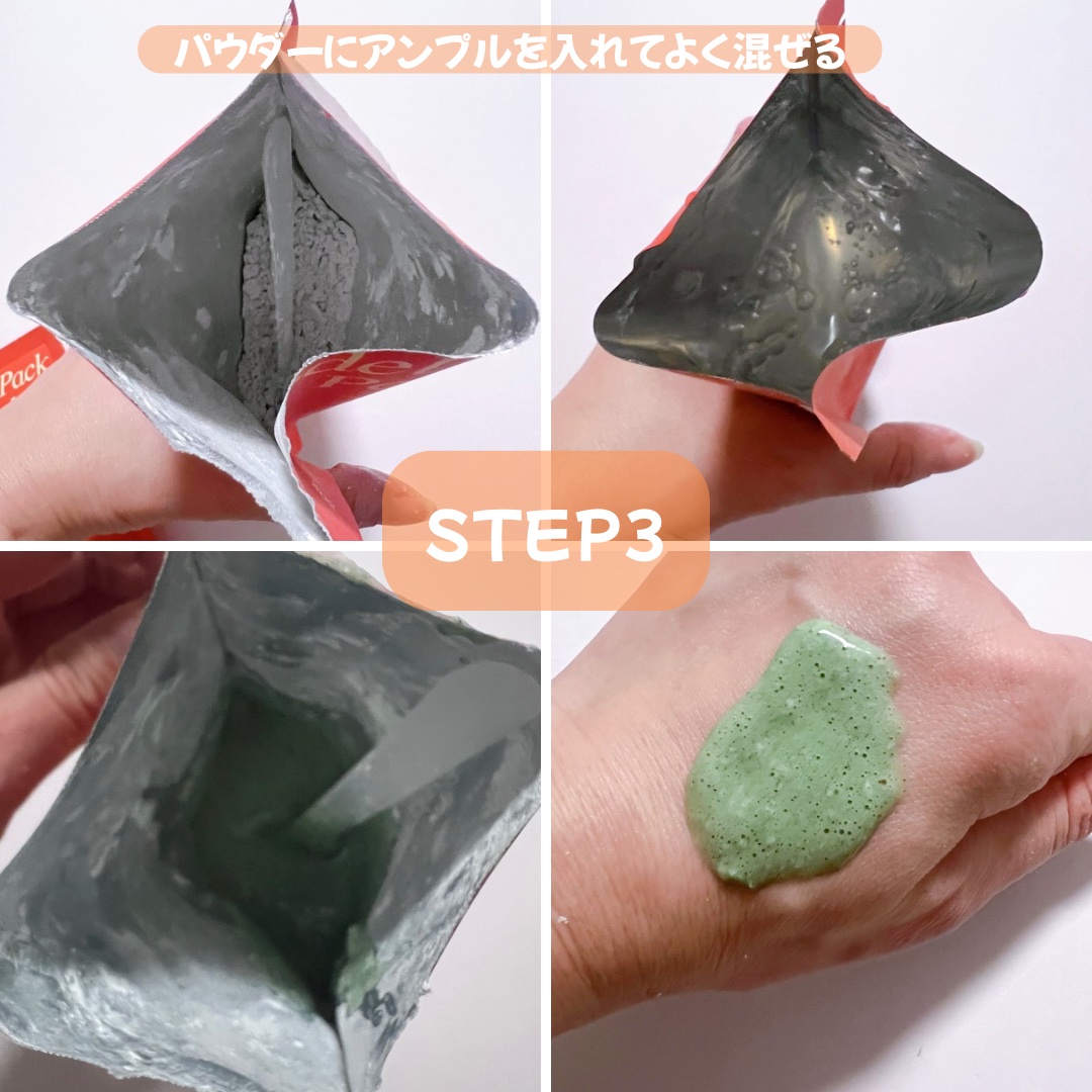 モデリングパックにスパチュラは付いていましたがアンプルとパウダーを混ぜるボウルは自身で用意します。2剤を混ぜると緑色でドロッとしたモデリングパックが完成。どことなく磯っぽい匂いがします。クロレラかな?スパチュラで丁寧にお肌に乗せ15~20分程...