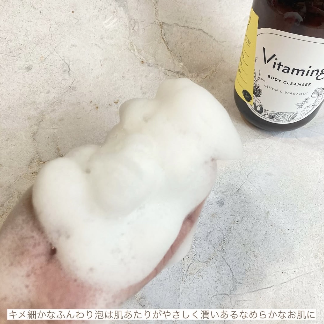 7種類のビタミン、6種類のエッセンシャルオイルを配合した、ビタミンのうるおい泡で全身ケアできるボディソープです。 香りはレモン&ベルガモット、柑橘系の爽やかな香りが優しく広がります。 肌へのやさしさにこだわり、100%天然由来の洗浄成分と厳選した保湿成分を配合しているそうで、さっぱりとしっとりが両立されている感じがしました❤
