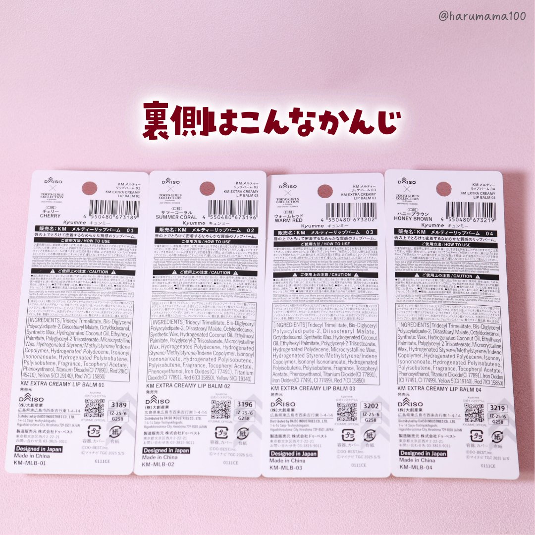 東京ガールズコレクション(TGC)とコラボした「Kyumme(キュンミー)meets TOKYO GIRLS COLLECTION 2025 SPRING / SUMMER」は全国のDAISO、ダイソーネットストアで本日3月1日(土)より順次発売します。 スティックもわりと柔らかくて塗り心地そこまで悪くなかったかな?? ひとぬりでけっこう発色するから何回かに分けて薄く・軽く塗るのをお勧め☝️ ͗ ͗︎︎ コロンと小さいので持ち運びもできそう𓂃𓈒໒꒱𓏸