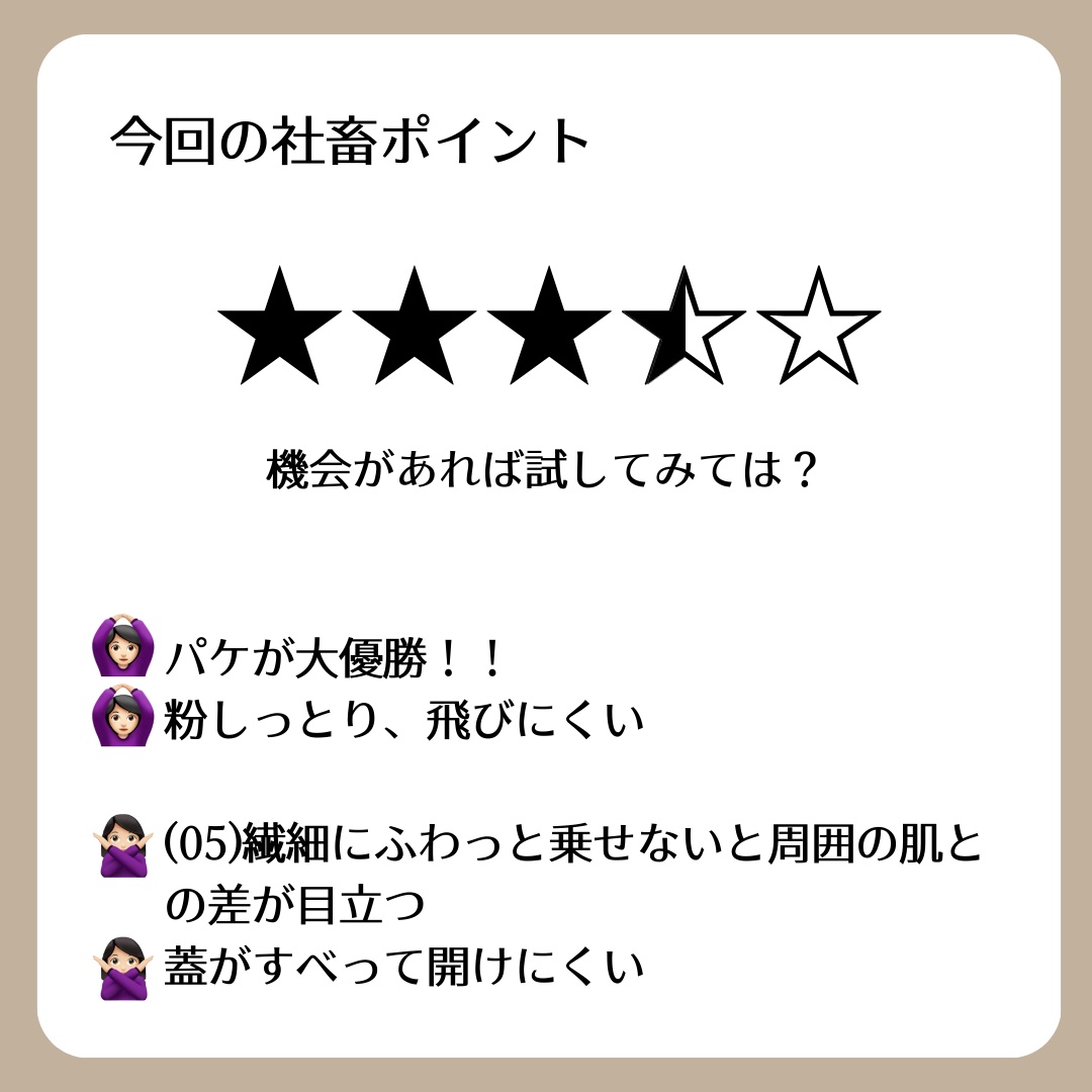 | ハイライト・シェーディングランキング第3位 | 粉質はしっとりしています。 肌馴染みが良くて浮きすぎることなく 使いやすかったです。 | 詳細を見る | |