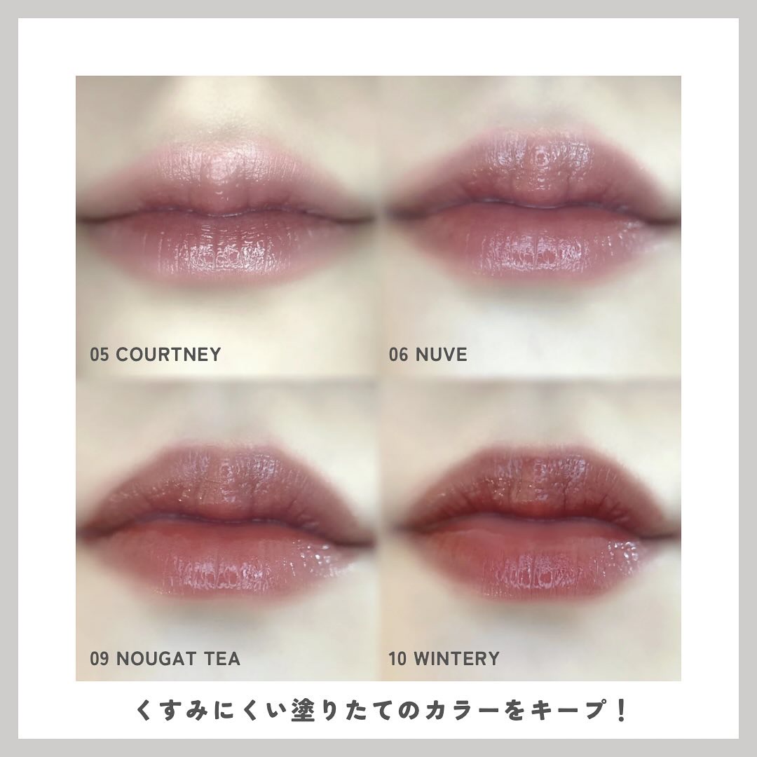 - <01 ミルキーヴァイン> 水、ジフェニルジメチコン、リンゴ酸ジイソステアリル、ビスジグリセリルポリアシルアジペート-2、オクチルドデカノール、水添ポリイソブテン、グリセリン、ダイマージリノール酸ダイマージリノレイルビス(ベヘニル/イソステアリル/フィトステリル)、DPG、セチルPEG/PPG-10/1ジメチコン、イソステアリン酸ソルビタン、ポリソルベート60、1,2-ヘキサンジオール、(アクリル酸ヒドロキシエチル/アクリロイルジメチルタウリンNa)コポリマー、フェノキシエタノール、セテアレス-20、酸化チタン、スクワラン、香料、ステビアエキス、エチルヘキシルグリセリン、赤227、黄4、赤104(1)、水酸化Al、ポリアクリル酸アンモニウム、黄5、BG、青1、アラントイン、パンテノール、テトラ(ジ-t-ブチルヒドロキシヒドロケイヒ酸)ペンタエリスリチル <02 ティーンメロウ> 水、ジフェニルジメチコン、リンゴ酸ジイソステアリル、ビスジグリセリルポリアシルアジペート-2、オクチルドデカノール、水添ポリイソブテン、グリセリン、ダイマージリノール酸ダイマージリノレイルビス(ベヘニル/イソステアリル/フィトステリル)、DPG、セチルPEG/PPG-10/1ジメチコン、イソステアリン酸ソルビタン、ポリソルベート60、1,2-ヘキサンジオール、酸化チタン、(アクリル酸ヒドロキシエチル/アクリロイルジメチルタウリンNa)コポリマー、フェノキシエタノール、セテアレス-20、スクワラン、黄5、香料、酸化鉄、ステビアエキス、エチルヘキシルグリセリン、赤227、赤104(1)、ポリアクリル酸アンモニウム、水酸化Al、BG、アラントイン、パンテノール、黄4、テトラ(ジ-t-ブチルヒドロキシヒドロケイヒ酸)ペンタエリスリチル <03 フェイデッドポージー> 水、ジフェニルジメチコン、リンゴ酸ジイソステアリル、ビスジグリセリルポリアシルアジペート-2、オクチルドデカノール、水添ポリイソブテン、グリセリン、ダイマージリノール酸ダイマージリノレイルビス(ベヘニル/イソステアリル/フィトステリル)、DPG、セチルPEG/PPG-10/1ジメチコン、イソステアリン酸ソルビタン、ポリソルベート60、1,2-ヘキサンジオール、(アクリル酸ヒドロキシエチル/アクリロイルジメチルタウリンNa)コポリマー、フェノキシエタノール、セテアレス-20、酸化チタン、スクワラン、香料、ステビアエキス、エチルヘキシルグリセリン、赤227、黄4、酸化鉄、ポリアクリル酸アンモニウム、水酸化Al、赤104(1)、BG、アラントイン、パンテノール、テトラ(ジ-t-ブチルヒドロキシヒドロケイヒ酸)ペンタエリスリチル <04 ベイキッド> 水、ジフェニルジメチコン、リンゴ酸ジイソステアリル、ビスジグリセリルポリアシルアジペート-2、オクチルドデカノール、水添ポリイソブテン、グリセリン、ダイマージリノール酸ダイマージリノレイルビス(ベヘニル/イソステアリル/フィトステリル)、DPG、セチルPEG/PPG-10/1ジメチコン、イソステアリン酸ソルビタン、ポリソルベート60、1,2-ヘキサンジオール、(アクリル酸ヒドロキシエチル/アクリロイルジメチルタウリンNa)コポリマー、フェノキシエタノール、セテアレス-20、スクワラン、酸化チタン、酸化鉄、香料、ステビアエキス、エチルヘキシルグリセリン、黄5、赤227、黄4、ポリアクリル酸アンモニウム、水酸化Al、BG、アラントイン、パンテノール、テトラ(ジ-t-ブチルヒドロキシヒドロケイヒ酸)ペンタエリスリチル <07 グレーフィグ> 水、ジフェニルジメチコン、リンゴ酸ジイソステアリル、ビスジグリセリルポリアシルアジペート-2、オクチルドデカノール、水添ポリイソブテン、グリセリン、ダイマージリノール酸ダイマージリノレイルビス(ベヘニル/イソステアリル/フィトステリル)、DPG、セチルPEG/PPG-10/1ジメチコン、イソステアリン酸ソルビタン、ポリソルベート60、1,2-ヘキサンジオール、(アクリル酸ヒドロキシエチル/アクリロイルジメチルタウリンNa)コポリマー、フェノキシエタノール、セテアレス-20、スクワラン、酸化チタン、酸化鉄、香料、ステビアエキス、エチルヘキシルグリセリン、赤227、黄5、ポリアクリル酸アンモニウム、黄4、水酸化Al、BG、アラントイン、パンテノール、テトラ(ジ-t-ブチルヒドロキシヒドロケイヒ酸)ペンタエリスリチル <08 ロジスト> 水、ジフェニルジメチコン、リンゴ酸ジイソステアリル、ビスジグリセリルポリアシルアジペート-2、オクチルドデカノール、水添ポリイソブテン、グリセリン、ダイマージリノール酸ダイマージリノレイルビス(ベヘニル/イソステアリル/フィトステリル)、DPG、セチルPEG/PPG-10/1ジメチコン、イソステアリン酸ソルビタン、ポリソルベート60、1,2-ヘキサンジオール、(アクリル酸ヒドロキシエチル/アクリロイルジメチルタウリンNa)コポリマー、フェノキシエタノール、セテアレス-20、スクワラン、酸化チタン、酸化鉄、香料、ステビアエキス、エチルヘキシルグリセリン、黄5、赤227、ポリアクリル酸アンモニウム、赤104(1)、黄4、水酸化Al、BG、アラントイン、パンテノール