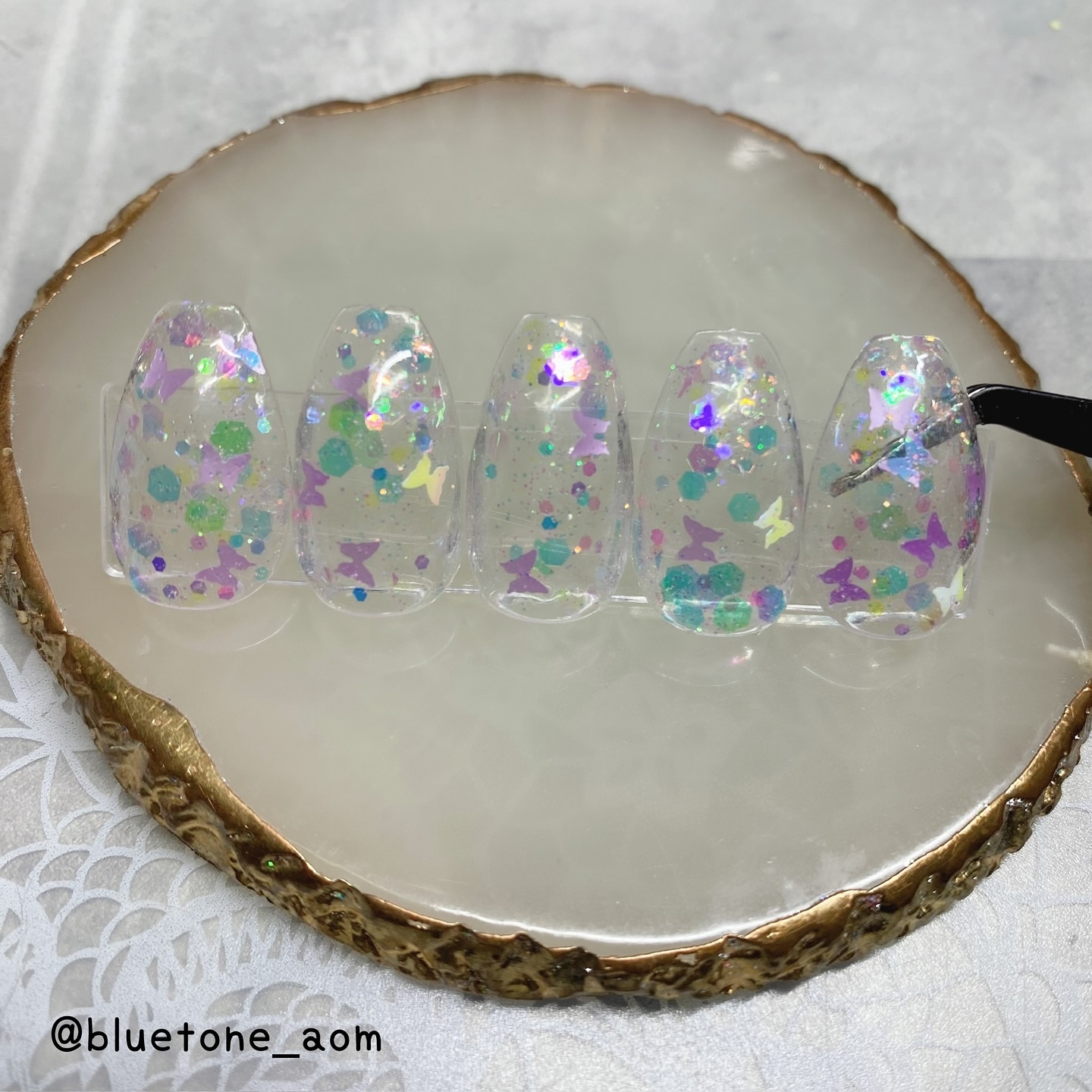 ラメがしっかりしてるし クリアカラーが入ってるから オーロラパウダー無しでも 充分キラキラしました! 反射強めのフィルムなので 実物はもっと うるうるとキラキラが強いです! ビー玉みたい🥺 ネイルシール長持ちさせたいけど ちょっと飽きてきたな〜って時とかに 全然違った印象になるのでオススメです! Seriaのベースジェル 本当にうるうるネイルしやすいので オススメしたい🙆♀️