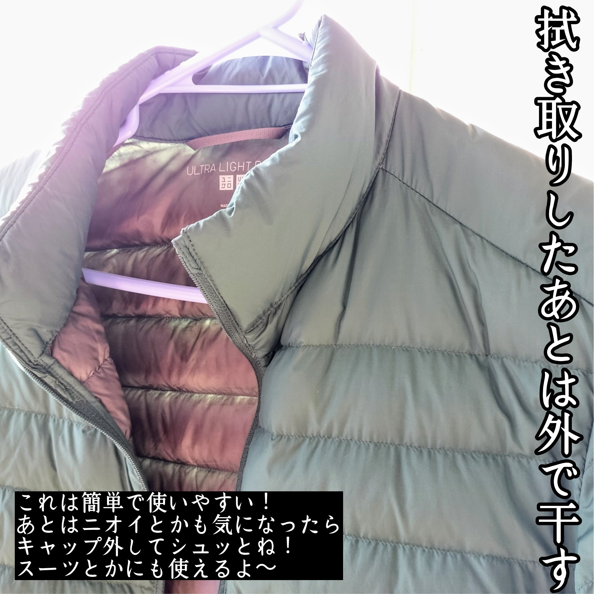 水不要アウターウェアクリーナー🧥✨ ダウンジャケットなどのアウターウェアに吹きかけて、拭き取るだけのお手軽洗剤です。 消臭出来てる👍 内側の袖口の汚れも綺麗に落ちました😍 キャップをくるくる回して外すと、消臭スプレーに変身♡ 2wayで使えるのも便利👍