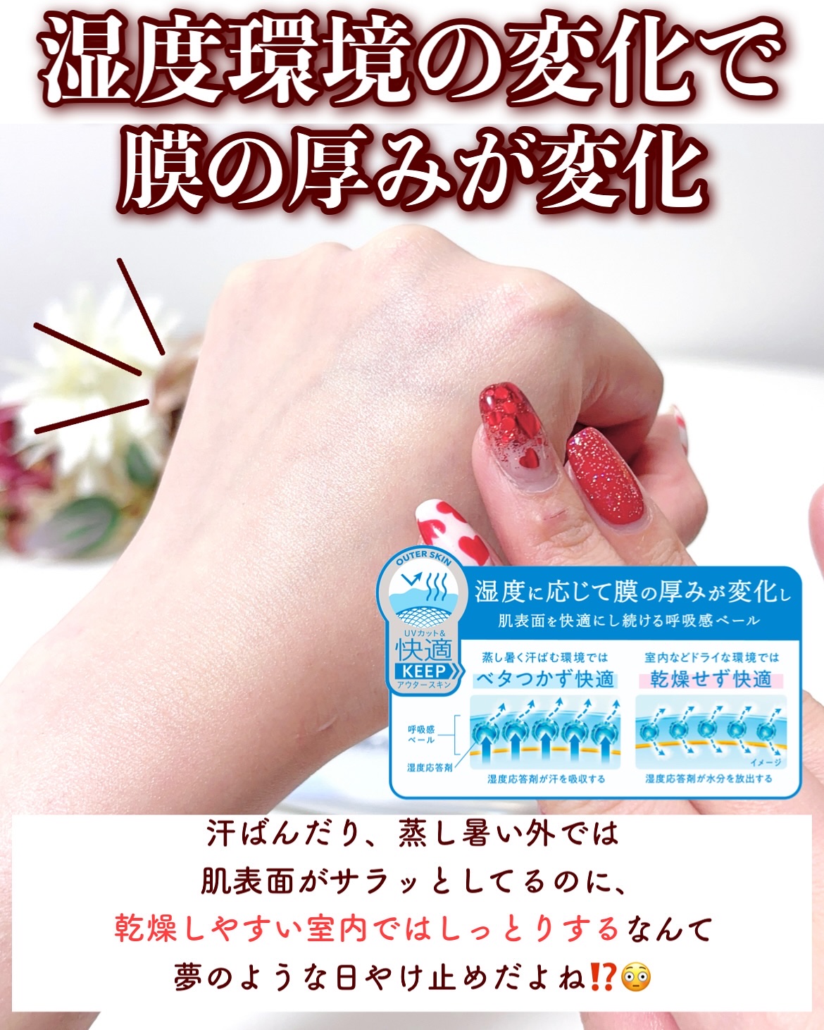 - 湿度の変化に応じて膜の厚みが変化! 肌表面を快適にし続ける「呼吸感ベールUV」 蒸し暑く汗ばむ環境ではベタつかず、 室内などドライな環境では乾燥を防ぎます。 テクスチャーは3変化する「密着スフレクリーム」。 出した瞬間は、ふわっ。 塗り広げるとじゅわっと肌に溶け込むようになじみ 少し経つと、さらっ。 肌が呼吸するような軽いベールが心地よくフィット。 SPF50+ PA++++。強力紫外線から肌を守ります。 さらに!うれしいポイント ・肌の透明感UP!*1美肌パウダーIN ・美容液成分(保湿)配合*2 ・スーパーウォータープルーフ ・汗水に強く、せっけんで落とせる ・化粧下地にも使える ・合成着色料無配合 ・アレルギーテスト済み*3 ・ニキビになりにくい処方(ノンコメドジェニックテスト済み*3 ) ・心地いいエアリーフローラルの香り *1メイクアップ効果 *2ヒアルロン酸・ビタミンC誘導体(アスコルビルグルコシド)・BG *3 すべての方にコメド(ニキビのもと)ができない、アレルギーが起こらないというわけではありません。