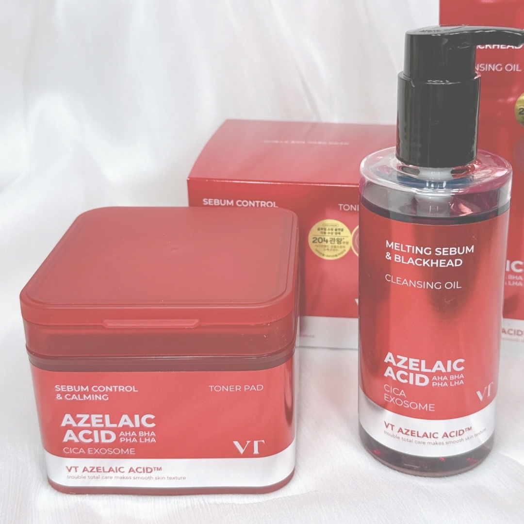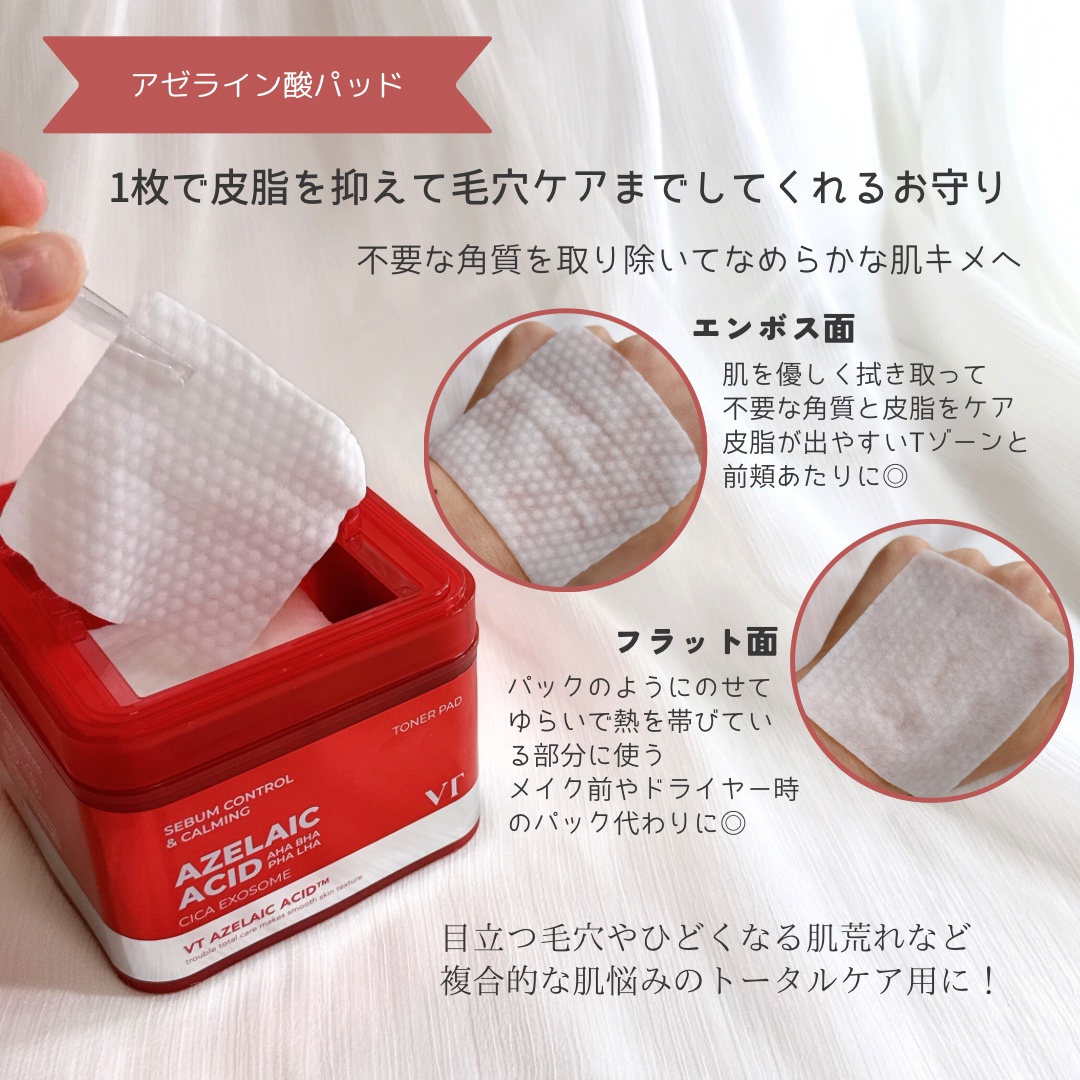 VT史上最高自信作のクレンジング!! ブラックヘッド、ホワイトヘッド、皮脂・角質コントロールまでしてくれるアゼライン酸*クレンジング❤️ ウォータリーテクスチャーでオイル感のベタつく感じがしないです◎ 素早く乳化し、つっぱり感がなくしっとりした洗い心地です✨ 底までひたひたのトナーパッドは、エンボス面とフラット面の2in1✨ 気になる部分に合わせて、ふきとりとパックで使い分けできます◎