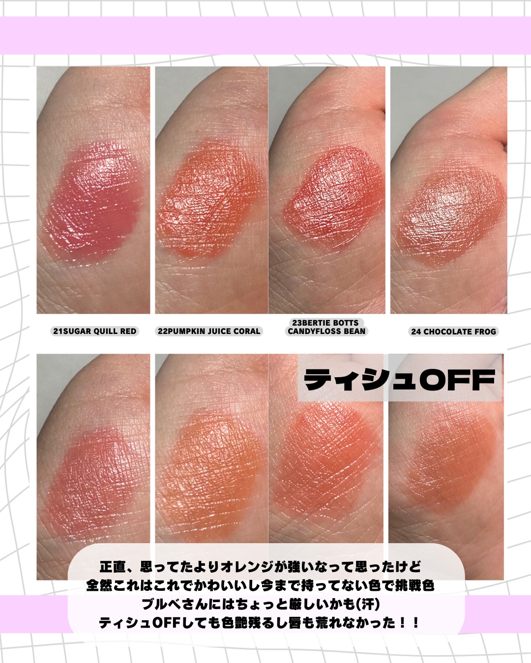 - <01 ビンテージアップル(VINTAGE APPLE)> リンゴ酸ジイソステアリル、水、ビスジグリセリルポリアシルアジペート-2、トリメチルシロキシフェニルジメチコン、水添ポリイソブテン、ダイマージリノール酸ダイマージリノレイルビス(ベヘニル/イソステアリル/フィトステリル)、ポリフェニルシルセスキオキサン、ジグリセリン、セチルPEG/PPG-10/1ジメチコン、ポリソルベート60、セテアレス-20、1,2-ヘキサンジオール、(アクリル酸ヒドロキシエチル/アクリロイルジメチルタウリンNa)コポリマー、スクワラン、ベヘニルアルコール、フェノキシエタノール、カプリリルグリコール、酸化チタン、黄5、赤227、香料、イソステアリン酸ソルビタン、水酸化Al、ポリアクリル酸アンモニウム、青1、BG、トリ(カプリル酸/カプリン酸)グリセリル、テトラ(ジ-t-ブチルヒドロキシヒドロケイヒ酸)ペンタエリスリチル、バラエキス <02 サマーアプリコット(SUMMER APRICOT)> リンゴ酸ジイソステアリル、水、ビスジグリセリルポリアシルアジペート-2、トリメチルシロキシフェニルジメチコン、水添ポリイソブテン、ダイマージリノール酸ダイマージリノレイルビス(ベヘニル/イソステアリル/フィトステリル)、ポリフェニルシルセスキオキサン、ジグリセリン、セチルPEG/PPG-10/1ジメチコン、ポリソルベート60、セテアレス-20、1,2-ヘキサンジオール、(アクリル酸ヒドロキシエチル/アクリロイルジメチルタウリンNa)コポリマー、スクワラン、ベヘニルアルコール、フェノキシエタノール、酸化チタン、カプリリルグリコール、香料、黄4、黄5、赤227、イソステアリン酸ソルビタン、水酸化Al、ポリアクリル酸アンモニウム、赤104(1)、BG、青1、トリ(カプリル酸/カプリン酸)グリセリル、テトラ(ジ-t-ブチルヒドロキシヒドロケイヒ酸)ペンタエリスリチル、バラエキス <03 ブラッシュドピーチ(BLUSHED PEACH)> リンゴ酸ジイソステアリル、水、ビスジグリセリルポリアシルアジペート-2、トリメチルシロキシフェニルジメチコン、ダイマージリノール酸ダイマージリノレイルビス(ベヘニル/イソステアリル/フィトステリル)、水添ポリイソブテン、ポリフェニルシルセスキオキサン、ジグリセリン、セチルPEG/PPG-10/1ジメチコン、ポリソルベート60、セテアレス-20、1,2-ヘキサンジオール、(アクリル酸ヒドロキシエチル/アクリロイルジメチルタウリンNa)コポリマー、スクワラン、ベヘニルアルコール、フェノキシエタノール、酸化チタン、カプリリルグリコール、香料、赤227、イソステアリン酸ソルビタン、黄4、黄5、水酸化Al、ポリアクリル酸アンモニウム、BG、トリ(カプリル酸/カプリン酸)グリセリル、テトラ(ジ-t-ブチルヒドロキシヒドロケイヒ酸)ペンタエリスリチル、バラエキス <04 ペールプラム(PALE PLUM)> リンゴ酸ジイソステアリル、水、ビスジグリセリルポリアシルアジペート-2、トリメチルシロキシフェニルジメチコン、水添ポリイソブテン、ダイマージリノール酸ダイマージリノレイルビス(ベヘニル/イソステアリル/フィトステリル)、ポリフェニルシルセスキオキサン、ジグリセリン、セチルPEG/PPG-10/1ジメチコン、ポリソルベート60、セテアレス-20、1,2-ヘキサンジオール、(アクリル酸ヒドロキシエチル/アクリロイルジメチルタウリンNa)コポリマー、スクワラン、ベヘニルアルコール、酸化チタン、フェノキシエタノール、カプリリルグリコール、香料、黄5、赤227、イソステアリン酸ソルビタン、黄4、赤104(1)、水酸化Al、ポリアクリル酸アンモニウム、酸化鉄、青1、BG、トリ(カプリル酸/カプリン酸)グリセリル、テトラ(ジ-t-ブチルヒドロキシヒドロケイヒ酸)ペンタエリスリチル、バラエキス <05 フレッシュチェリー(FRESH CHERRY)> リンゴ酸ジイソステアリル、水、ビスジグリセリルポリアシルアジペート-2、トリメチルシロキシフェニルジメチコン、水添ポリイソブテン、ダイマージリノール酸ダイマージリノレイルビス(ベヘニル/イソステアリル/フィトステリル)、ポリフェニルシルセスキオキサン、ジグリセリン、セチルPEG/PPG-10/1ジメチコン、ポリソルベート60、セテアレス-20、1,2-ヘキサンジオール、(アクリル酸ヒドロキシエチル/アクリロイルジメチルタウリンNa)コポリマー、スクワラン、ベヘニルアルコール、フェノキシエタノール、カプリリルグリコール、赤227、香料、黄4、赤104(1)、イソステアリン酸ソルビタン、黄5、青1、BG、トリ(カプリル酸/カプリン酸)グリセリル、テトラ(ジ-t-ブチルヒドロキシヒドロケイヒ酸)ペンタエリスリチル、バラエキス <06 デイリーモーブ(DAILY MAUVE)> リンゴ酸ジイソステアリル、水、ビスジグリセリルポリアシルアジペート-2、トリメチルシロキシフェニルジメチコン、水添ポリイソブテン、ダイマージリノール酸ダイマージリノレイルビス(ベヘニル/イソステアリル/フィトステリル)、ポリフェニルシルセスキオキサン、ジグリセリン、セチルPEG/PPG-10/1ジメチコン、ポリソルベート60、セテアレス-20、1,2-ヘキサンジオール、(アクリル酸ヒドロキシ
