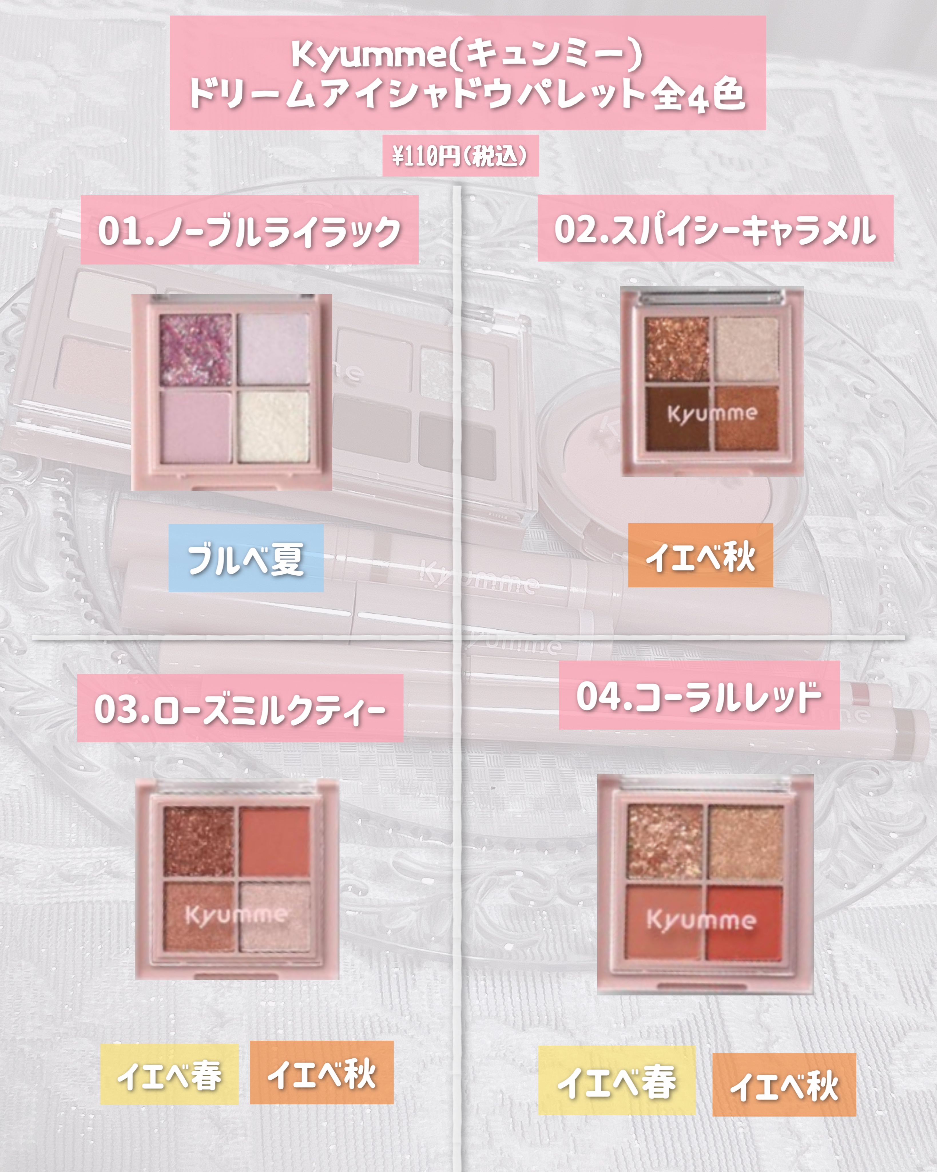 \全色スウォッチ!kyummeマルチパーパスパレット/☑️各¥330ダイヤモンド型のチークをはじめ全7色のマルチパレット。 チーク、アイシャドウ、アイブロウ、マットハイライトなど、これ1つで色々なメイクが作れる☝️⭐️01ストロベリーソーダダ...