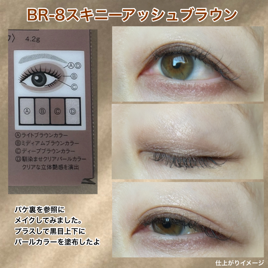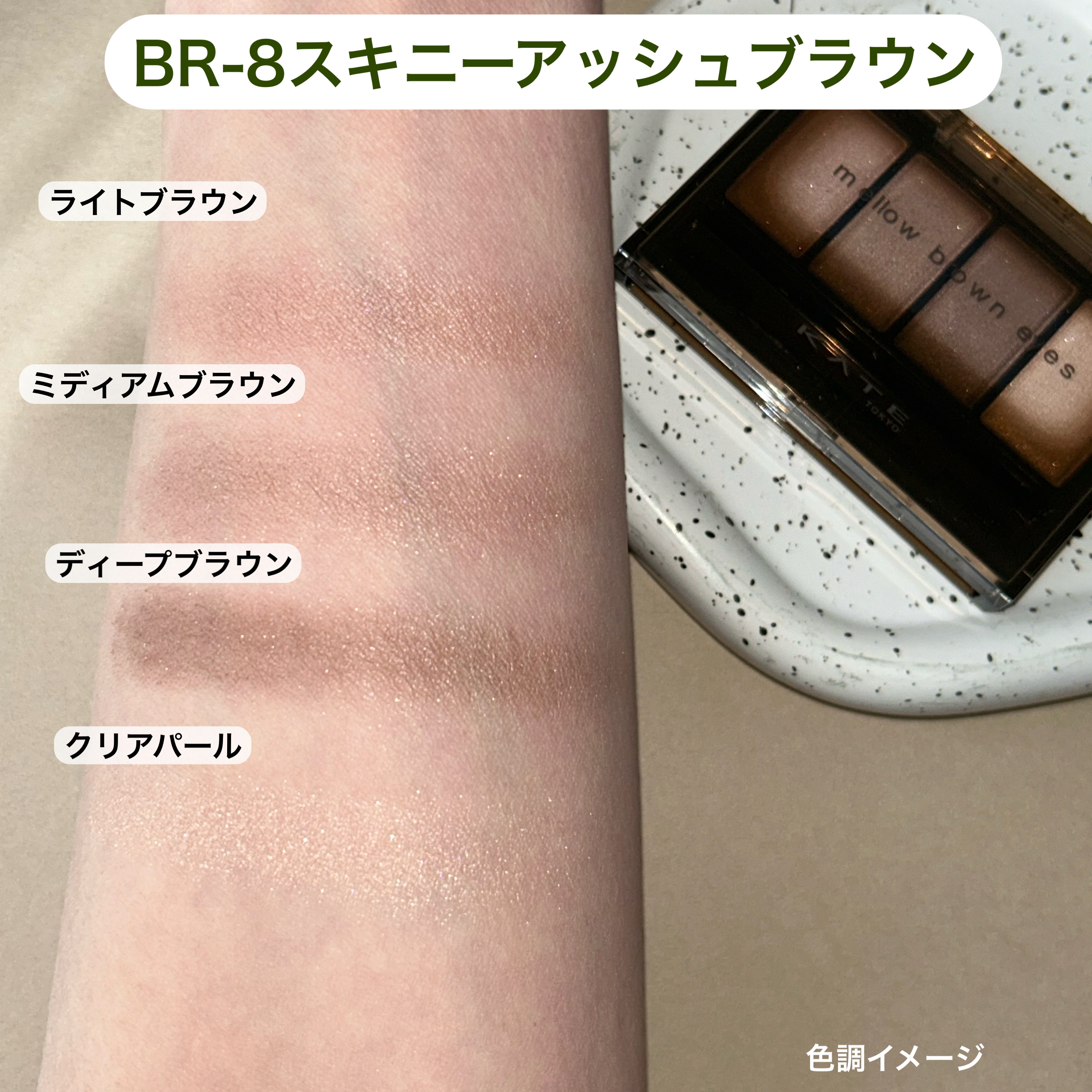 KATEケイトメロウブラウンアイズBR-8スキニーアッシュブラウン¥1,320スモーキーな色合いのブラウンシャドウ🤎粉質はサラサラしてる感じで繊細なパールが可愛い︎💕︎︎1番右のクリアパールカラーを重ねるともっとキラキラになる❗️涙袋とまぶた...