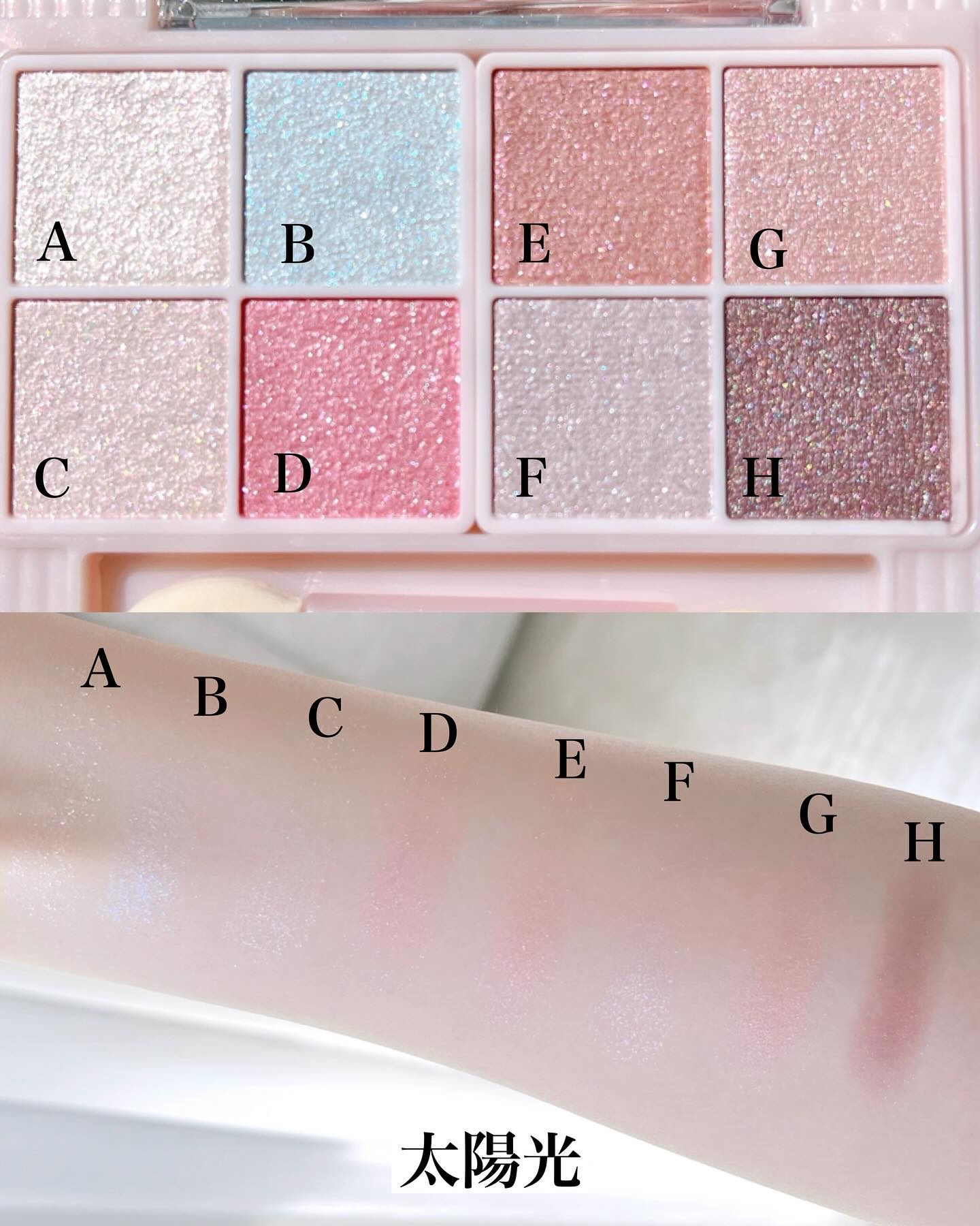 - いつでも一緒💗多色なのに持ち歩ける! 8色入りアイシャドウパレットのラメバージョン✨ 持ち運びやすいサイズ感なのに、贅沢に8色入り&便利なダブルエンドチップ付。 これ1つでアイシャドウが完成するように、 スパークリングタイプは「ラメだけがのるパウダー」を6色、 「ベースが透けて発色するパウダー」を2色セットしています! 使い道に困るような大きすぎるラメではなく、 使いやすさを重視し普段のメイクにも取り入れやすいサイズの ラメを採用しました♪ 他のアイシャドウに合わせて使うのもオススメです✨