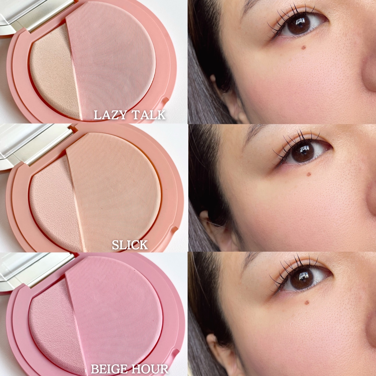 反対色で盛れツヤほっぺ“コントラストカラー” 色相が離れた反対色のハイライトとチーク。色幅が広いから、重ねるだけでツヤが引き立つんだとか✨ 隣接色でじんわりナチュほっぺ“グラデーションカラー” 同系色のハイライトとチークだから自然に馴染んで盛れる?!🫣💖 粉質はどちらかというと硬く感じました。 個人的には指塗りも好きです👏💓