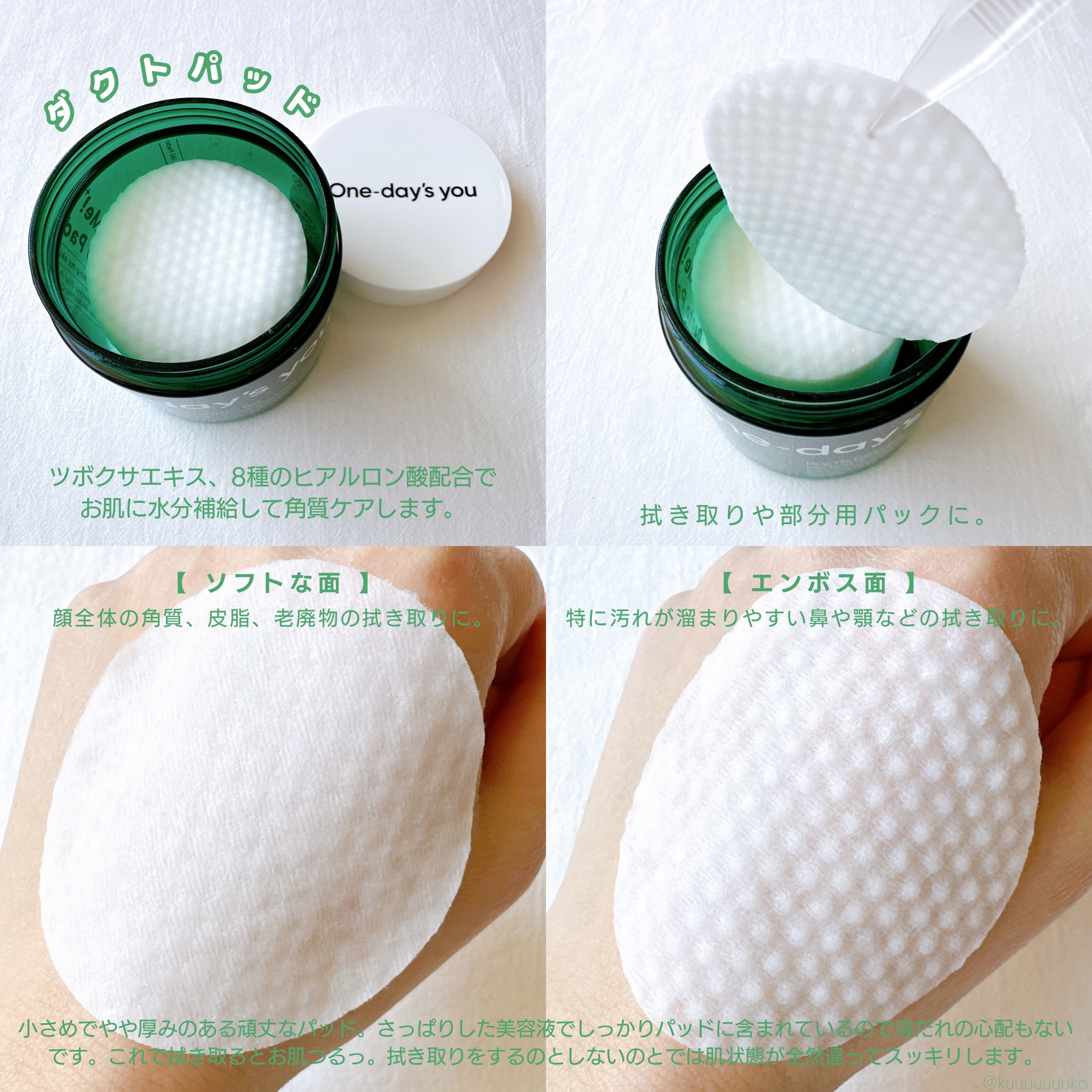 リピ品🍀One-day’syouダクトパット🍀パッドは厚みもあって、フラット面とエンボス面があり、1枚で顔全体を拭き取り&角質ケアも✨全体をフラット面で拭き取ってから気になる部分をエンボス面で拭くのがお気に入り!爽やかな香りも好き♡季節の変わ...