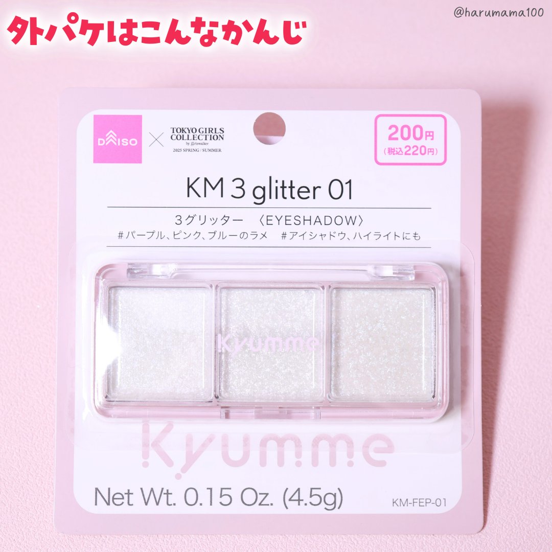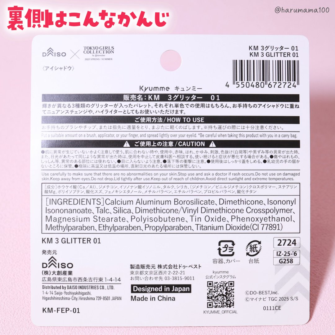 東京ガールズコレクション(TGC)とコラボした「Kyumme(キュンミー)meets TOKYO GIRLS COLLECTION 2025 SPRING / SUMMER」は全国のDAISO、ダイソーネットストアで本日3月1日(土)より順次発売します。 つけてみるとラメ感が全部違って斬新👀✧︎*。ニュアンスチェンジしたいときに使い分けると毎日メイクが楽しくなりそう♪ 粉飛びもそこまでしなくて使いやすかった◎