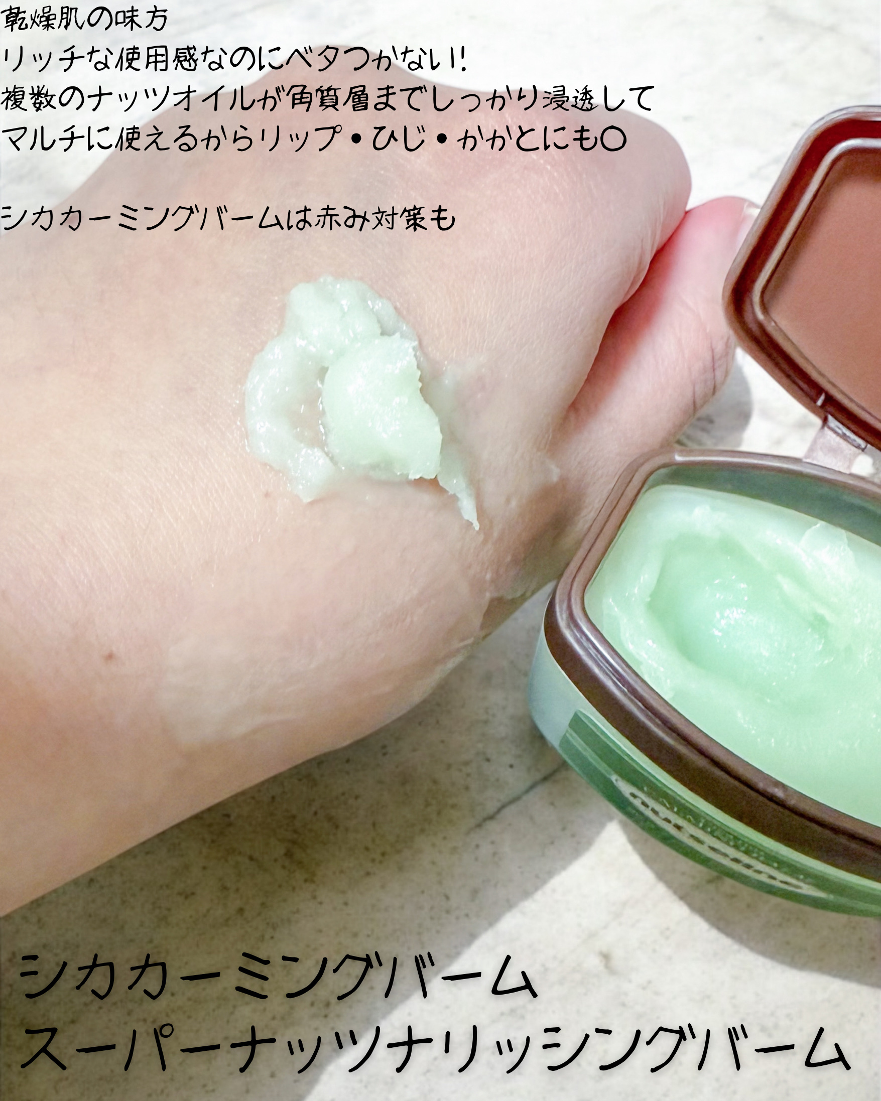 肌の皮脂と似た構造の植物由来オイルが配合してい自然に馴染み、潤いを与える 3つのナッツオイルを使用しているそうです💓 手にのせて馴染ませると、とろけるようにバームがとろけて艶と保湿感がすごくあります💓 乾燥したすべての所に200時間保湿との事ですごい持続時間ですよねー‼️🥹 刺激を受けて鎮静が必要な時はこちら💁♂️ シカナッツカーミングバーム💓 ほてった顔、頬、など刺激を受けた肌に毎日刺激を受ける敏感な部位に使えるバーム✨
