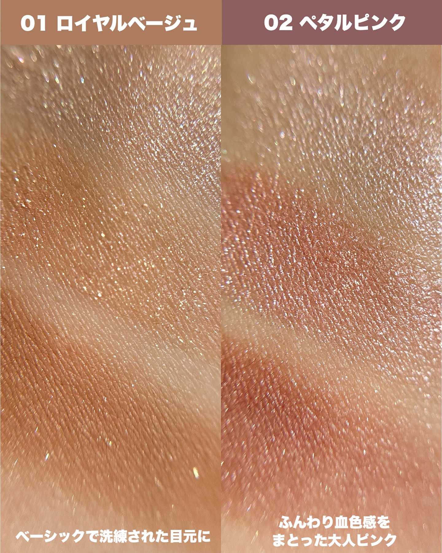光を纏ったような濡れツヤ瞼に仕上がるのでラメ入りアイシャドウが破格でコレは購入不可避🥹 01 ロイヤルベージュ ベーシックながら洗練された上品な煌めきを放つベージュ。 02 ペタルピンク ひらひらと舞う花びらをイメージしたふんわり血色感をまとうライラックピンク。
